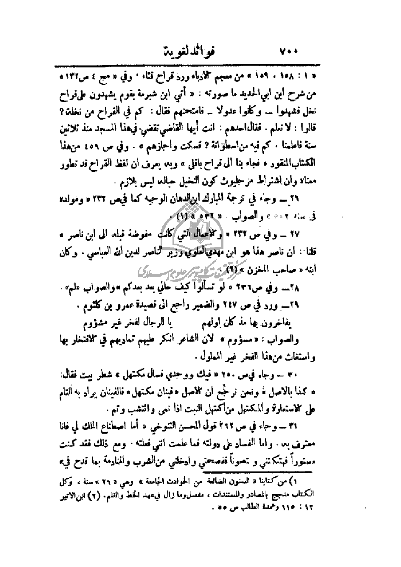 أحدهم: أنت أيها القاضي تقضي في هذا المسجد منذ ثلاثين سنة فأعلمنا، كم فيه من اسطوانة؟ فسكت وأجازهم). وفي ص 459 من هذا الكتاب المنقود (فجاء بنا إلى قراح باقلي) وبه يعرف أن لفظ القراح قد تطور معناه وان اشترط مرجليوث كون النخيل حياله ليس بلازم.