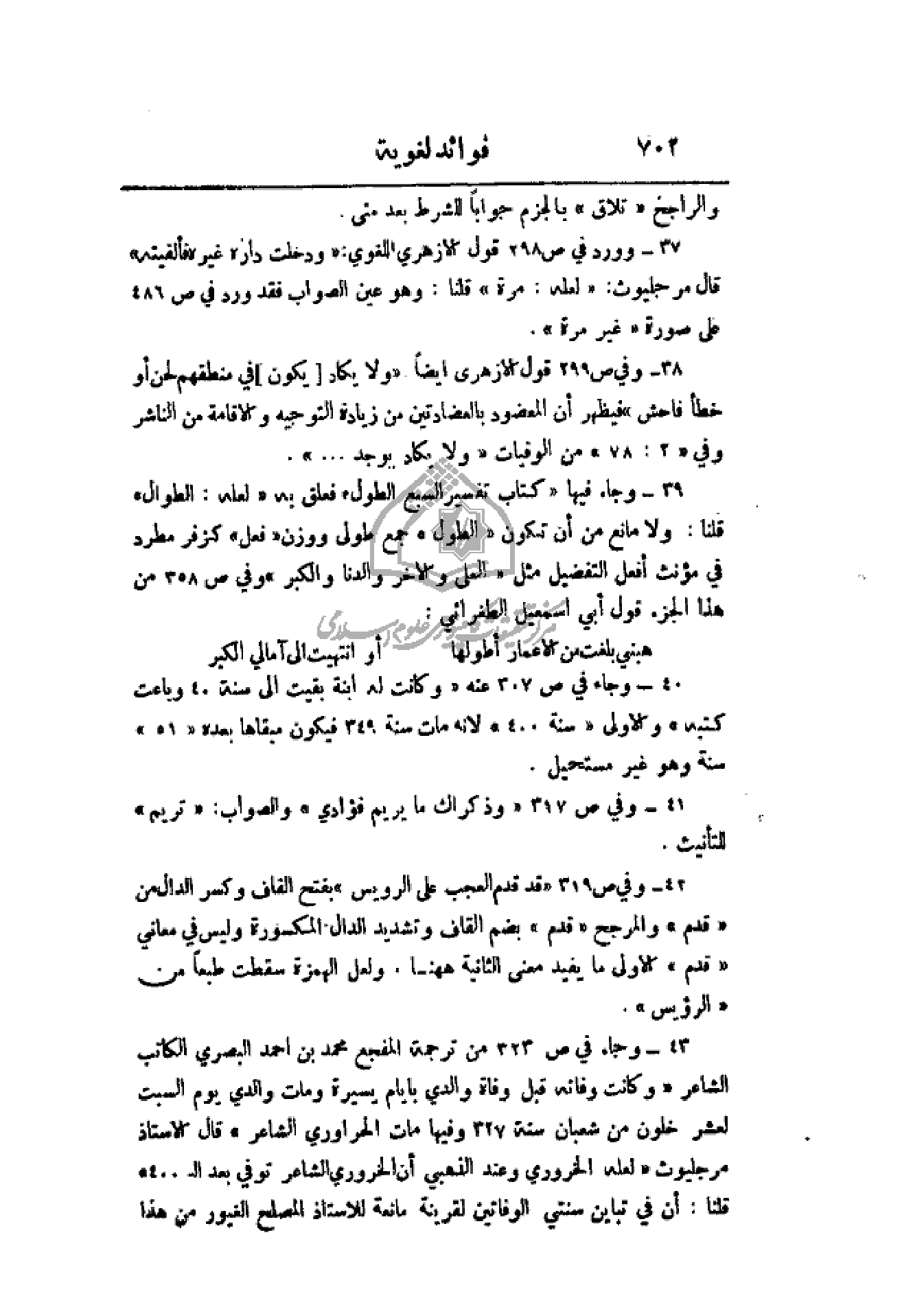 37 - وورد في ص 298 قول الأزهري اللغوي: (ودخلت داره غيره فألفيته) قال مرجليوث: (لعله: مرة) قلنا: وهو عين الصواب فقد ورد في ص 486 على صورة (غير مرة).