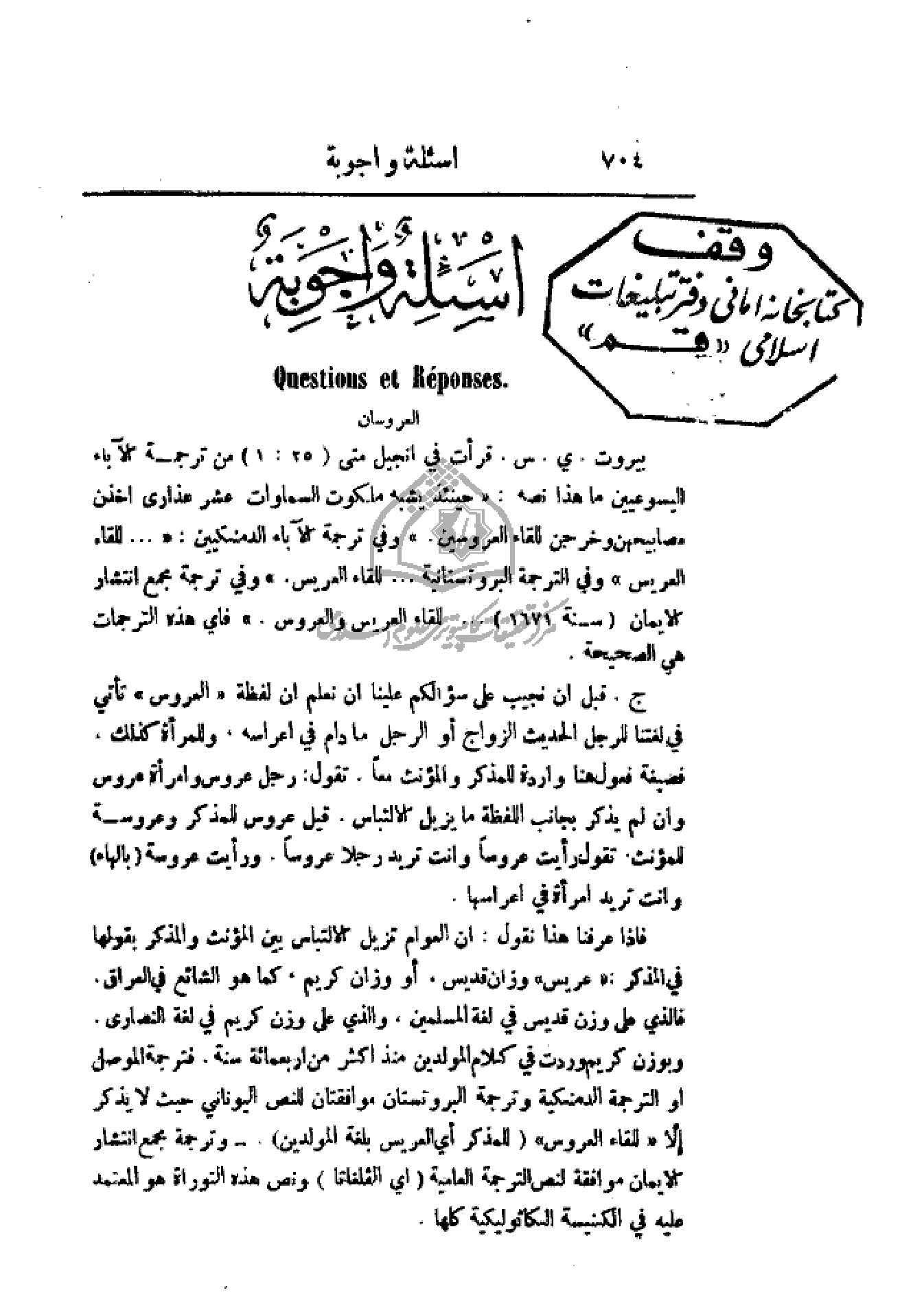 فإذا عرفنا هذا نقول: إن العوام تزيل الالتباس بين المؤنث والمذكر بقولها في المذكر: (عريس) وزان قديس، أو وزان كريم، كما هو الشائع في العراق. فالذي على وزن قديس في لغة المسلمين، والذي على وزن كريم في لغة النصارى. وبوزن كريم وردت في كلام المولدين منذ اكثر من أربعمائة سنة. فترجمة الموصل أو الترجمة الدمنكية وترجمة البروتستان موافقتان للنص اليوناني حيث لا يذكر إلا (للقاء العروس) (للمذكر أي العريس بلغة المولدين). - وترجمة مجمع انتشار الإيمان موافقة لنص الترجمة العامية (أي الفلغاتا) ونص هذه التوراة هو المعتمد عليه في الكنيسة الكاثوليكية كلها.