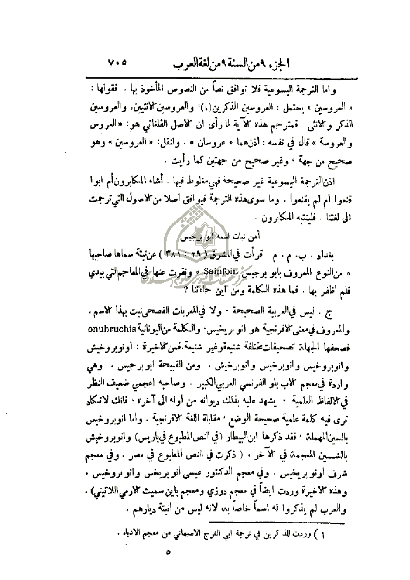 ج. ليس في العربية الصحيحة. ولا في المعربات الفصحى نبت بهذا الاسم. والمعروف في معنى الإفرنجية هو انوبريخيس، والكلمة من اليونانية فصحفها الجهلة تصحيفات مختلفة شنيعة وغير شنيعة، فمن الأخيرة: اونوبروخيش وانوبروخيس وانوبرخيس وانوبرخيش. ومن القبيحة ابوبرحبيس. وهي واردة في معجم الأب بلو الفرنسي العربي الكبير. وصاحبه أعجمي ضعيف النظر في الألفاظ العلمية. يشهد عليه بذلك ديوانه من أوله إلى آخره، فإنك لا تكاد ترى فيه كلمة علمية صحيحة الوضع، مقابلة اللغة الإفرنجية. وأما انوبروخيس بالسين المهملة، فقد ذكرها ابن البيطار (في النص المطبوع في باريس) وانوبروخيش بالشين المعجمة في الآخر، (ذكرت في النص المطبوع في مصر. وفي معجم شرف اونوبريخيس. وفي معجم الدكتور عيسى انوبريخس وانوبروخيس. وهذه الأخيرة وردت أيضاً في معجم دوزي ومعجم باين سميث الارمي اللاتيني).