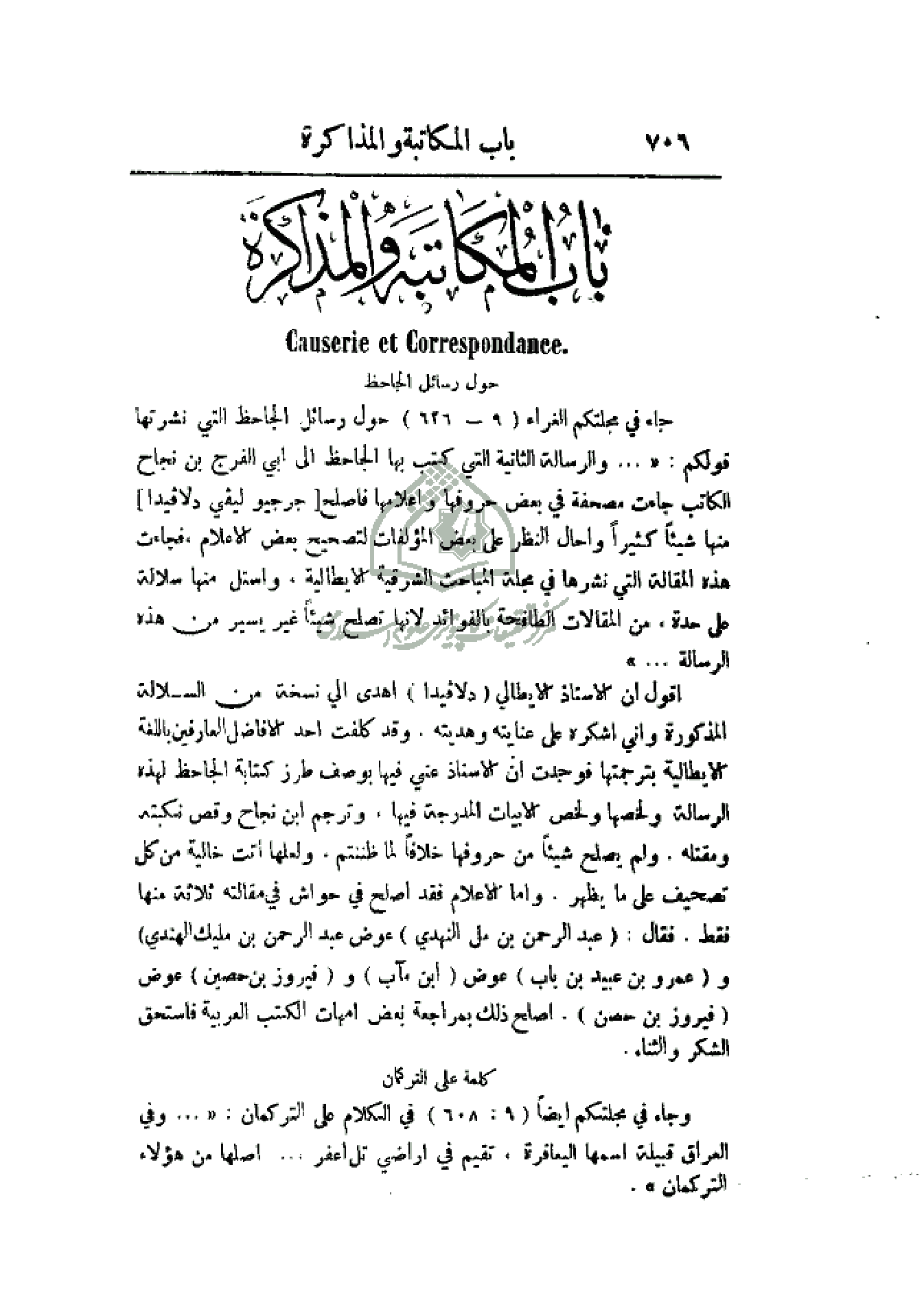 جاء في مجلتكم الغراء (9 - 626) حول رسائل الجاحظ التي نشرتها قولكم: (. . . والرسالة الثانية التي كتب بها الجاحظ إلى أبي الفرج بن نجاح الكاتب جاءت مصحفة في بعض حروفها وأعلامها فأصلح (جرجيو ليفي دلافيدا) منها شيئاً كثيراً وأجال النظر على بعض المؤلفات لتصحيح بعض الأعلام فجاءت هذه المقالة التي نشرها في مجلة المباحث الشرقية الإيطالية، واستل منها سلالة على حدة، من المقالات الطافحة بالفوائد لأنها تصلح شيئاً غير يسير من هذه الرسالة. . .).