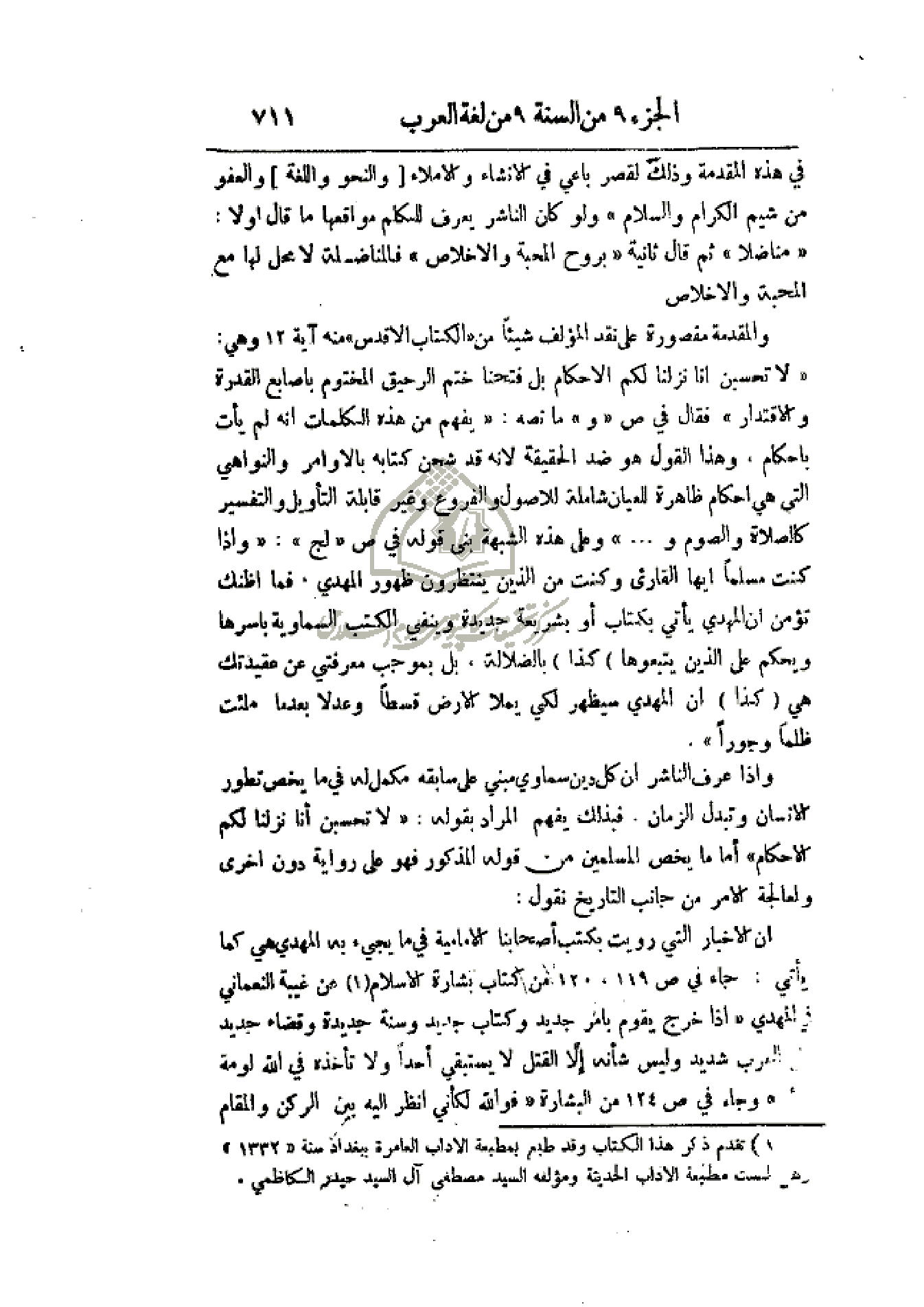 في ص (و) ما نصه: (يفهم من هذه الكلمات انه لم يأت بأحكام، وهذا القول هو ضد الحقيقة لأنه قد شحن كتابه بالأوامر والنواهي التي هي أحكام ظاهره للعيان شاملة للأصول والفروع وغير قابلة التأويل والتفسير كالصلاة والصوم و. . .) وعلى هذه الشبهة بنى قوله في ص (لج): (وإذا كنت مسلماً أيها القارئ وكنت من الذين ينتظرون ظهور المهدي، فما أظنك تؤمن أن المهدي يأتي بكتاب أو بشريعة جديدة وينفي الكتب السماوية بأسرها ويحكم على الذين يتبعوها) كذا) بالضلالة، بل بموجب معرفتي عن عقيدتك هي (كذا) أن المهدي سيظهر لكي يملأ الأرض قسطاً وعدلاً بعدما ملئت ظلماً وجوراً).