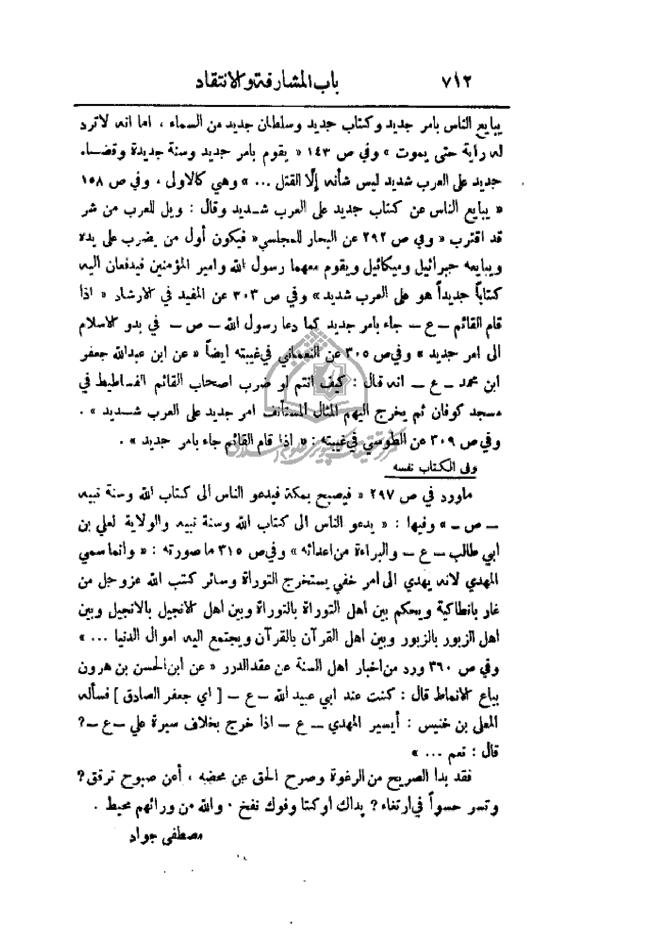 يبايع الناس بأمر جديد وكتاب جديد وسلطان جديد من السماء، أما انه لا ترد له راية حتى يموت) وفي ص 143 (يقوم بأمر جديد وسنة جديدة وقضاء جديد على العرب شديد ليس شأنه إلا القتل. . .) وهي كالأولى، وفي ص 158 (يبايع الناس عن كتاب جديد على العرب شديد وقال: ويل للعرب منشر قد اقترب (وفي ص 292 عن البحار للمجلسي (فيكون أول من يضرب على يده ويبايعه جبرائيل وميكائيل ويقوم معهما رسول الله وأمير المؤمنين فيدفعان إليه كتاباً جديداً هو على العرب شديد) وفي ص 303 عن المفيد في الإرشاد (إذا قام القائم - ع - جاء بأمر جديد كما دعا رسول الله - ص - في بدو الإسلام إلى أمر جديد) وفي ص 305 عن النعماني في غيبته أيضاً (عن ابن عبد الله جعفر ابن محمد - ع - انه قال: كيف انتم لو ضرب أصحاب القائم الفساطيط في مسجد كوفان ثم يخرج إليهم المثال المستأنف أمر جديد على العرب شديد). وفي ص