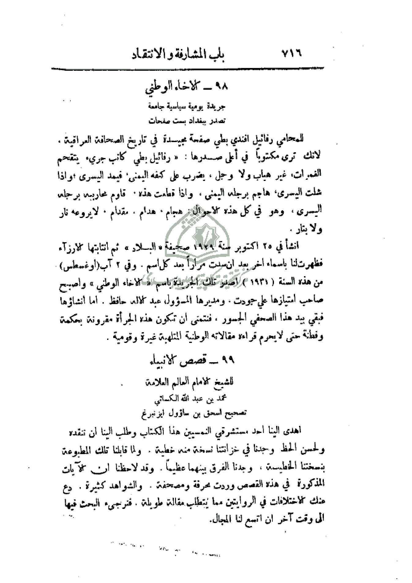 أهدي إلينا أحد مستشرقي النمسيين هذا الكتاب وطلب إلينا أن ننقده. ولحسن الحظ وجدنا في خزانتنا نسخة منه خطية. ولما قابلنا تلك المطبوعة بنسختنا الأصلية. وجدنا الفرق بينهما عظيماً. وقد لاحظنا أن الآيات المذكورة في هذه القصص وردت محرفة ومصحفة. والشواهد كثيرة، دع عنك الاختلافات في الروايتين مما يتطلب مقالة طويلة، فنرجئ البحث فيها إلى وقت آخر إن اتسع لنا المجال.