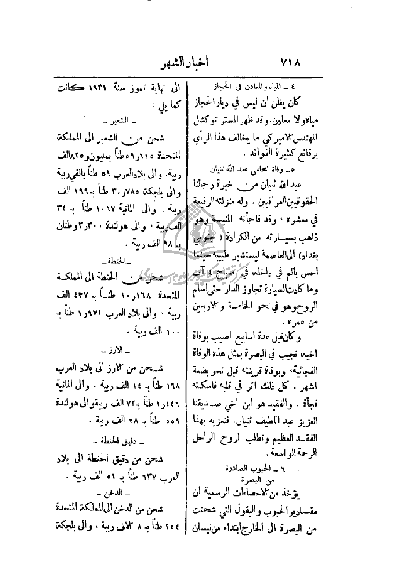 يؤخذ من الإحصاءات الرسمية إن مقادير الحبوب والبقول التي شحنت من البصرة إلى الخارج ابتداء من نيسان إلى نهاية تموز سنة 1931 كانت كما يلي: