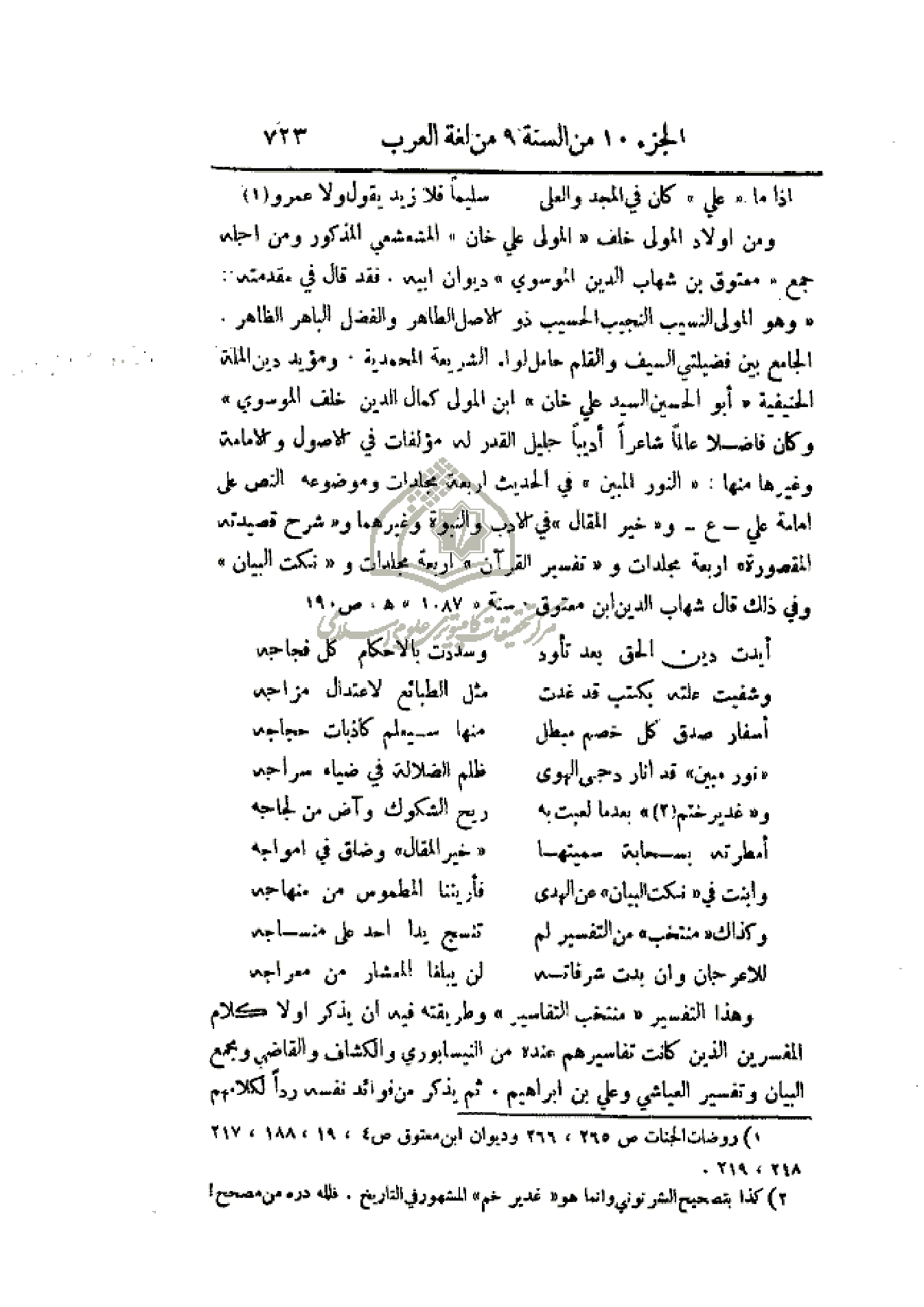 (وهو المولى النسيب النجيب الحسيب ذو الأصل الطاهر والفضل الباهر الظاهر. الجامع بين فضيلتي السيف والقلم حامل لواء الشريعة المحمدية، ومؤيد دين الملة الحنيفية (أبو الحسين السيد علي خان) ابن المولى كمال الدين خلف الموسوي) وكان فاضلاً عالماً شاعراً أديباً جليل القدر له مؤلفات في الأصول والإمامة وغيرها منها: (النور المبين) في الحديث أربعة مجلدات وموضوعه النص على إمامة علي - ع - و (خير المقال) في الأدب والنبوة وغيرهما و (شرح قصيدته المقصورة) أربعة مجلدات و (تفسير القرآن) أربعة مجلدات و (نكت البيان) في ذلك قال شهاب الدين ابن معتوق سنة (1087) هـ، ص 190.