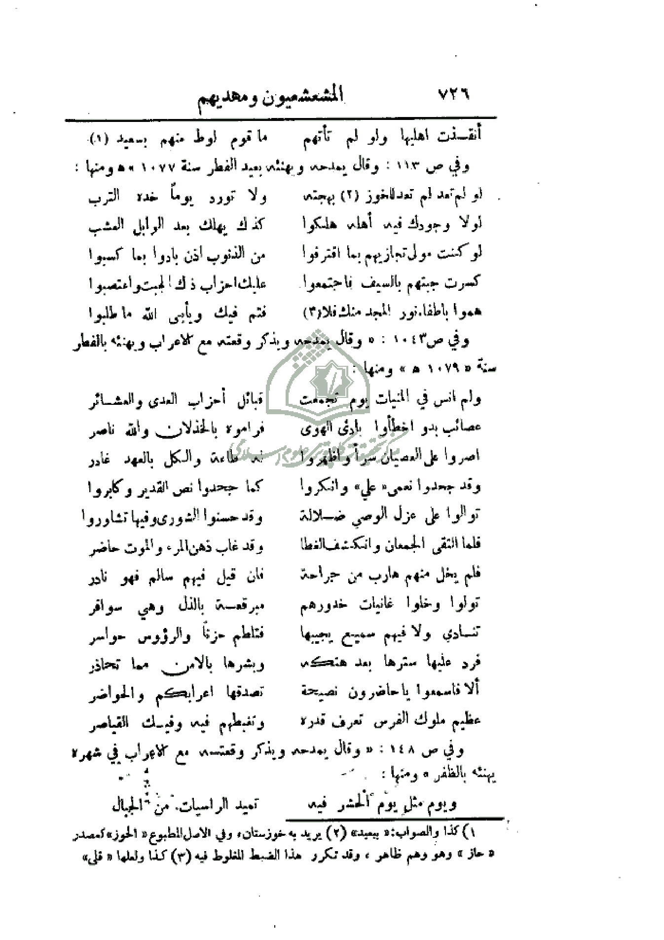 وفي ص 1043: (وقال يمدحه ويذكر وقعته مع الأعراب ويهنئه بالفطر سنة (1079 هـ) ومنها: