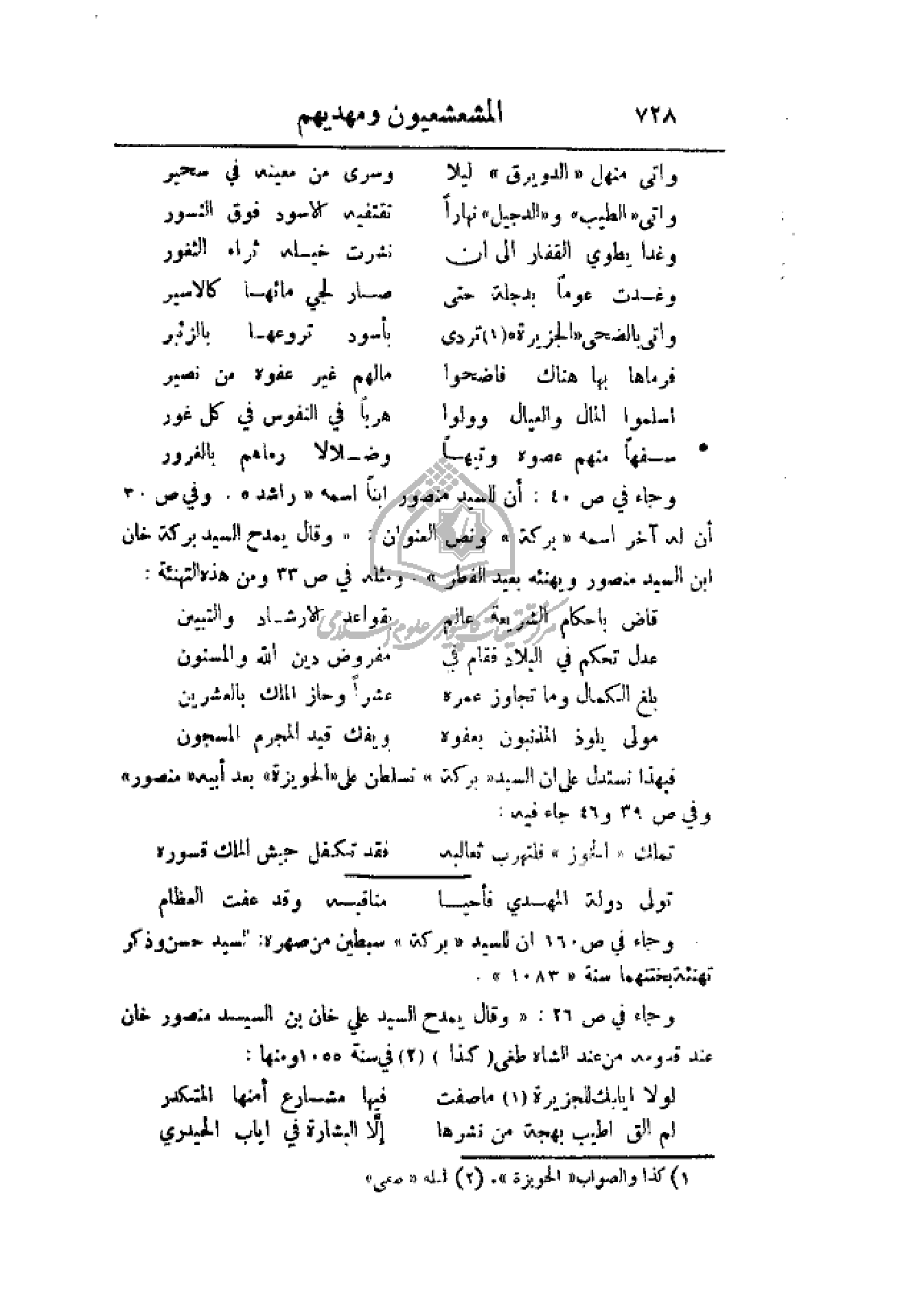 وجاء في ص 40: إن للسيد منصور ابناً اسمه (راشد). وفي ص 30 أن له آخر اسمه (بركة) ونص العنوان: (وقال يمدح السيد بركة خان ابن السيد منصور ويهنئه بعيد الفطر). ومثله في ص 33 ومن هذه التهنئة: