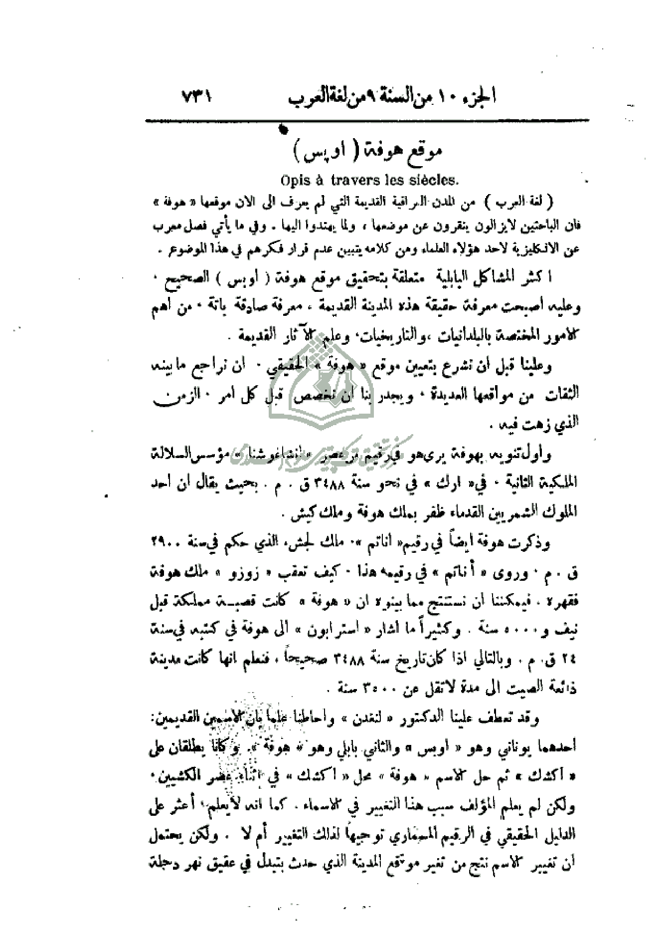 (لغة العرب) من المدن العراقية القديمة التي لم يعرف إلى الآن موقعها (هوفة) فإن الباحثين لا يزالون ينقرون عن موضعها، ولما يهتدوا إليها، وفي ما يأتي فصل معرب عن الإنكليزية لأحد هؤلاء العلماء ومن كلامه يتبين عدم قرار فكرهم في هذا الموضوع.