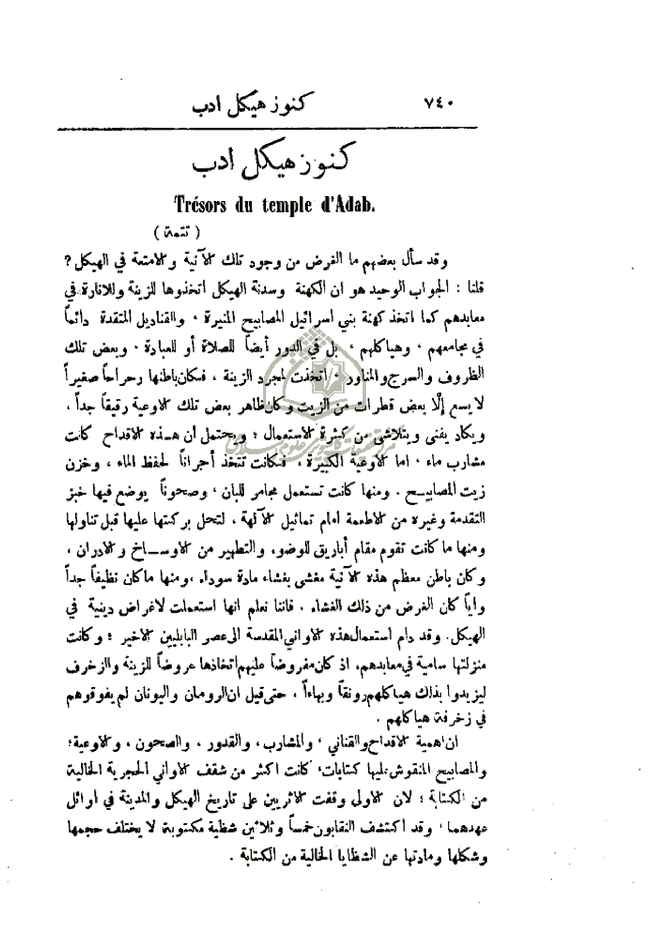 وقد سأل بعضهم ما الغرض من وجود تلك الآنية والأمتعة في الهيكل؟ قلنا: الجواب الوحيد هو أن الكهنة وسدنة الهيكل اتخذوها للزينة وللإنارة في معابدهم كما اتخذ كهنة بني إسرائيل المصابيح المنيرة، والقناديل المتقدة دائماً في مجامعهم، وهياكلهم، بل في الدور أيضاً للصلاة أو للعبادة، وبعض تلك الظروف والسرج والمناور، اتخذت لمجرد الزينة، فكان باطنها رحراحاً صغيراً لا يسع إلا بعض قطرات من الزيت وكان ظاهر بعض تلك الأوعية رقيقاً جداً، ويكاد يفنى ويتلاشى من كثرة الاستعمال؛ ويحتمل أن هذه الأقداح كانت مشارب ماء، أما الأوعية الكبيرة، فكانت تتخذ أجراناً لحفظ الماء، وخزن زيت المصابيح. ومنها كانت تستعمل مجامر للبان، وصحوناً يوضع فيها خبز التقدمة وغيره من الأطعمة أمام تماثيل الآلهة، لتحل بركتها عليها قبل تناولها ومنها ما كانت تقوم مقام أباريق للوضوء والتطهير من الأوساخ والأدران، وكان باطن معظم هذه الآنية مغشى بغشاء مادة سوداء، ومنها ما كان نظيفاً جداً وأياً كان الغرض من ذلك الغشاء، فإننا نعلم إنها استعملت لأغراض دينية في الهيكل. وقد دام استعمال هذه الأواني المقدسة إلى عصر البابليين الأخير؛ وكانت منزلتها سامية في معابدهم، إذ كان مفروضاً عليه اتخاذها عروضاً للزينة والزخرف ليزيدوا بذلك هياكلهم رونقاً وبهاءً، حتى قيل إن الرومان واليونان لم يفوقوهم في زخرفة هياكلهم.