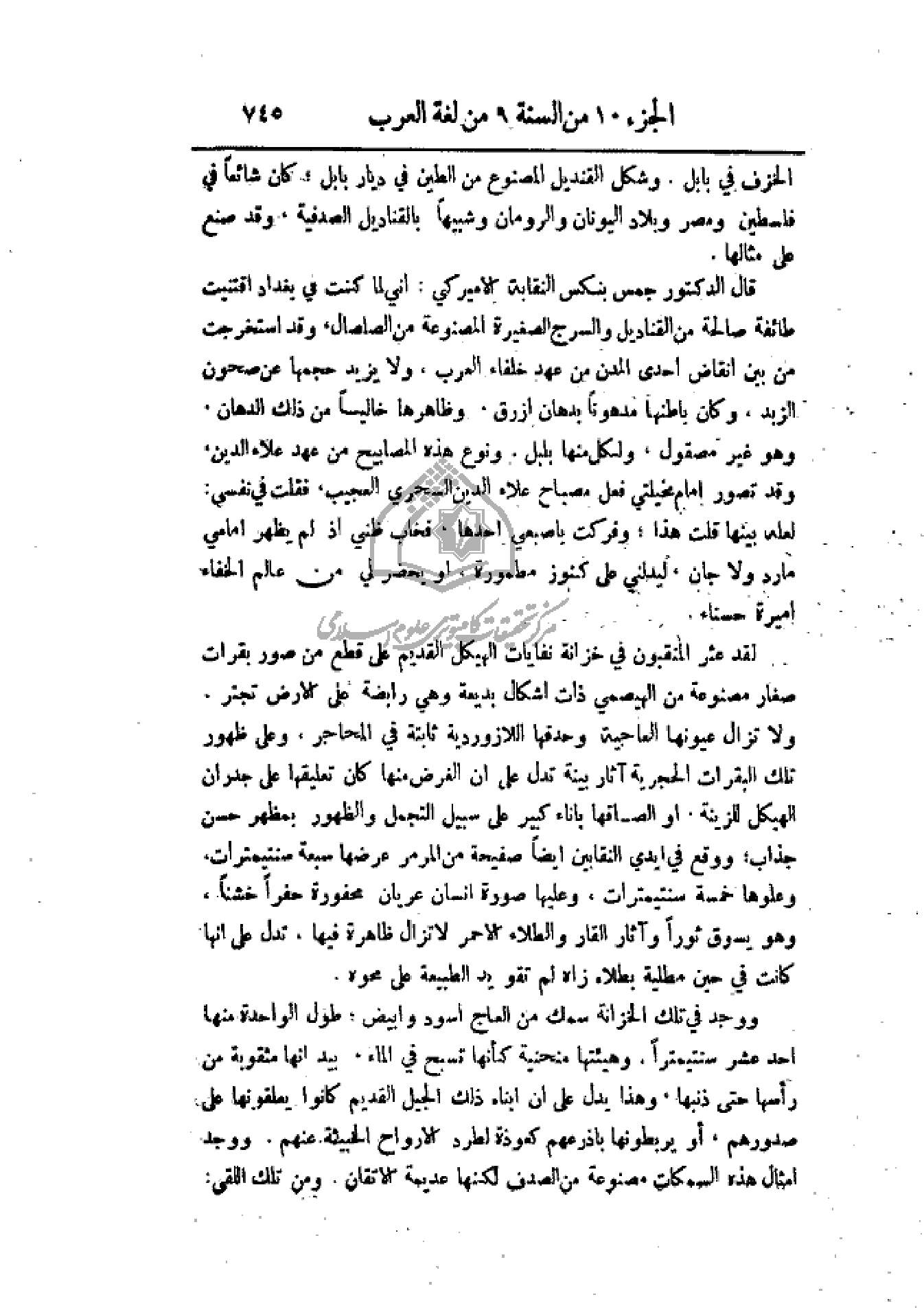 قال الدكتور جمس بنكس النقابة الأميركي: إني لما كنت في بغداد اقتنيت طائفة صالحة من القناديل والسرج الصغيرة المصنوعة من الصلصال، وقد استخرجت من بين أنقاض إحدى المدن من عهد خلفاء العرب، ولا يزيد حجمها عن صحون الزبد، وكان باطنها مدهوناً بدهان أزرق، وظاهرها خالياً من ذلك الدهان. وهو غير مصقول، ولكل منها بلبل. ونوع هذه المصابيح من عهد علاء الدين، وقد تصور أمام مخيلتي فعل مصباح علاء الدين السحري العجيب. فقلت في نفسي: لعله بينها قلت هذا؛ وفركت بإصبعي أحدها. فخاب ظني إذ لم يظهر أمامي مارد ولا جان، ليدلني على كنوز مطمورة، أو يحضر لي من عالم الخفاء أميرة حسناء.