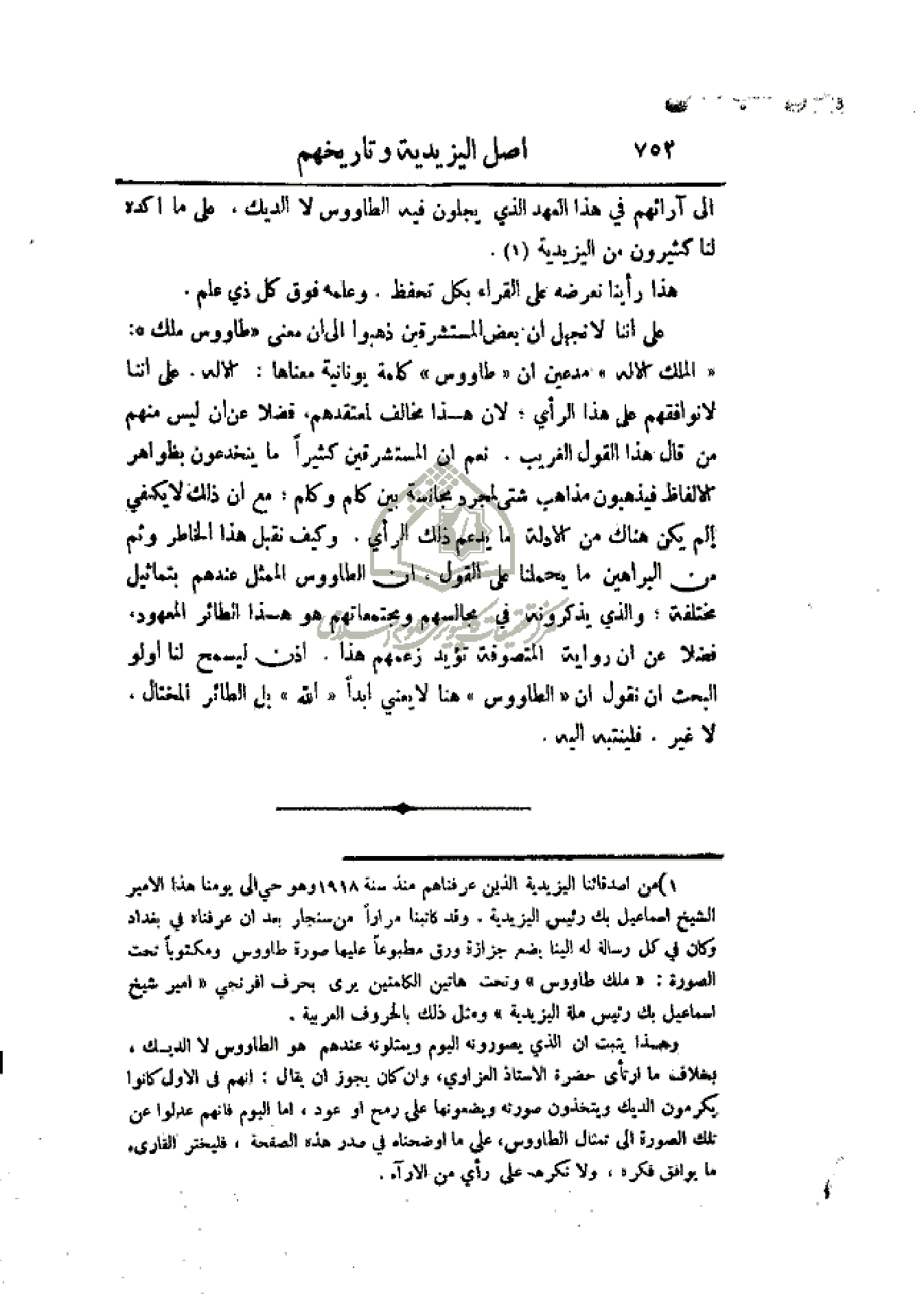 على إننا لا نجهل أن بعض المستشرقين ذهبوا إلى أن معنى (طاووس ملك): (الملك الإله) مدعين إن (طاووس) كلمة يونانية معناها: (الإله) على أننا لا نوافقهم على هذا الرأي؛ لأن هذا مخالف لمعتقدهم، فضلاً عن أن ليس منهم من قال هذا القول الغريب. نعم أن المستشرقين كثيراً ما ينخدعون بظواهر الألفاظ فيذهبون مذاهب شتى لمجرد مجانسة بين كلم وكلم؛ مع أن ذلك لا يكفي ألم يكن هناك من الأدلة ما يدعم ذلك الرأي. وكيف نقبل هذا الخاطر وثم من البراهين ما يحملنا على القول، أن الطاووس الممثل عندهم بتماثيل مختلفة؛ والذي يذكرونه في مجالسهم ومجتمعاتهم هو هذا الطائر المعهود، فضلاً عن أن رواية المتصوفة تؤيد زعمهم هذا. أذن ليسمح لنا أولو البحث أن نقول أن (الطاووس) هنا لا يعني أبداً (الله) بل الطائر المختال، لا غير. فلينتبه إليه.