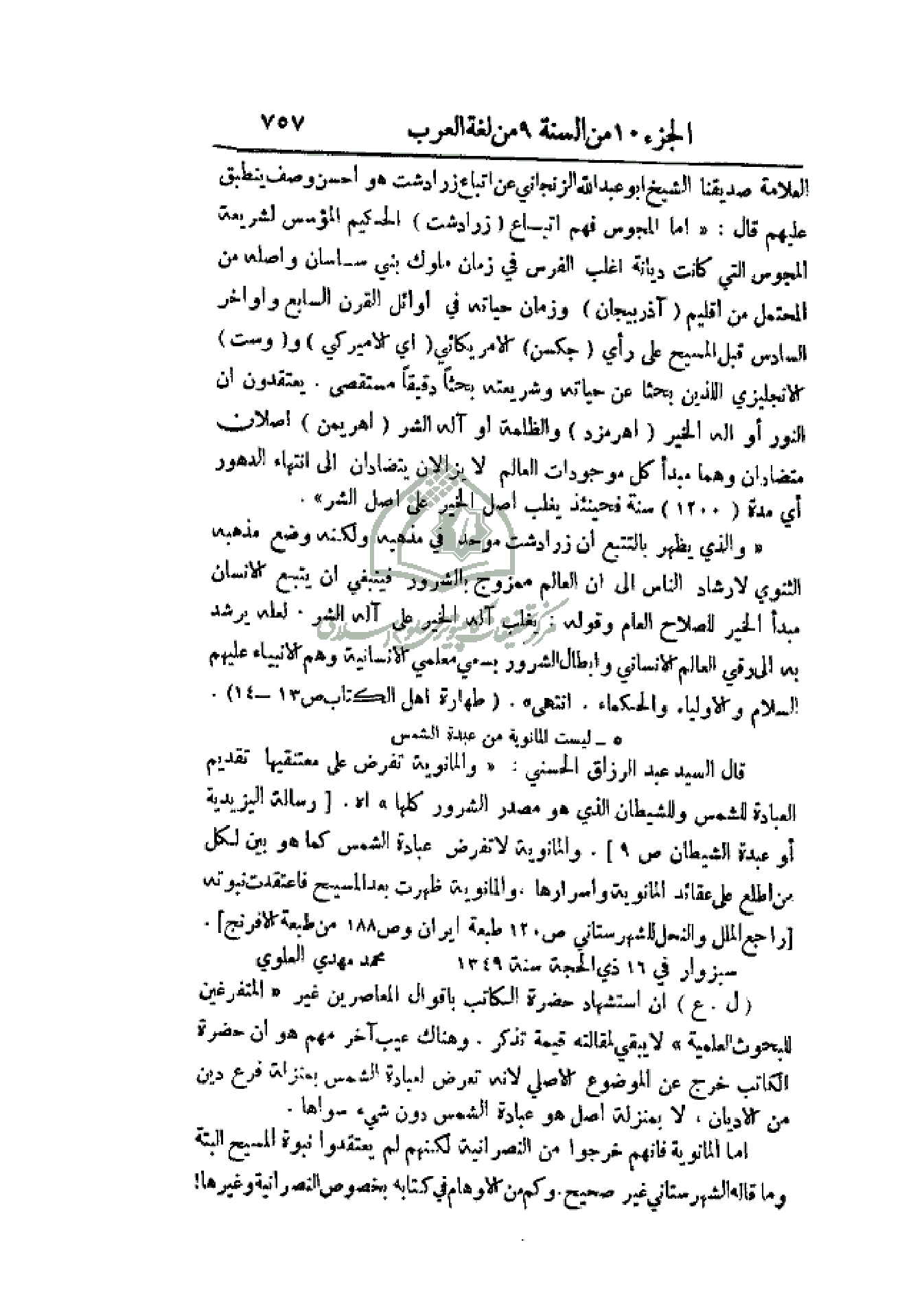 العلامة صديقنا الشيخ أبو عبد الله الزنجاني عن اتباع زرادشت هو أحسن وصف ينطبق عليهم قال: (أما المجوس فهم أتباع (زرادشت) الحكيم المؤسس لشريعة المجوس التي كانت ديانة أغلب الفرس في زمان ملوك بني ساسان وأصل من المحتمل من إقليم (آذربيجان) وزمان حياته في أوائل القرن السابع وأواخر السادس قبل المسيح على رأي (جكسن) الأمريكائي (أي الأميركي) و (وست) الإنجليزي اللذين بحثا عن حياته وشريعته بحثاً دقيقاً مستقصى. يعتقدون أن النور أو إله الخير (أهرمزد) والظلمة أو إله الشر (أهريمن) اصلان متضادان وهما مبدأ كل موجودات العالم لا يزالان يتضادان إلى انتهاء الدهور أي مدة (1200) سنة فحينئذ يغلب أصل الخير على أصل الشر).