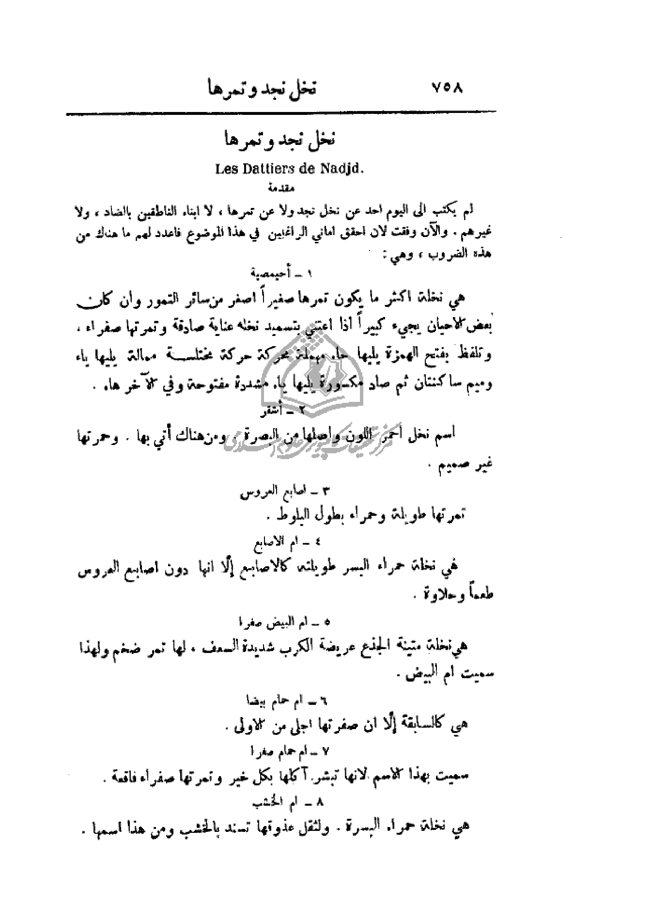 لم يكتب إلى اليوم أحد عن نخل نجد ولا عن تمرها، لا أبناء الناطقين بالضاد، ولا غيرهم. والآن وفقت لان أحقق أماني الراغبين في هذا الموضوع فاعدد لهم ما هناك من هذه الضروب، وهي: