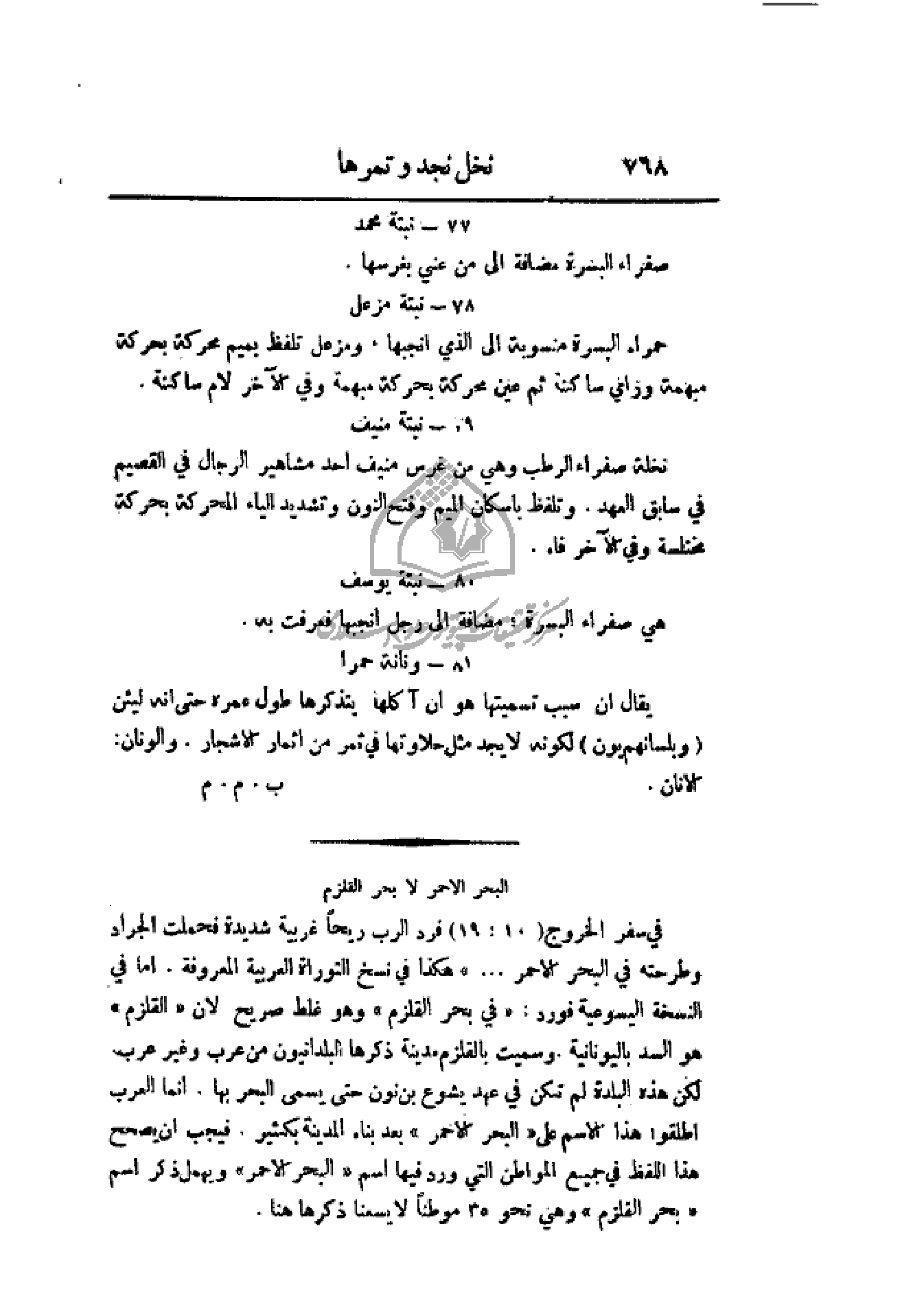 في سفر الخروج (10: 19) فرد الرب ريحاً غربية شديدة فحملت الجراد وطرحته في البحر الأحمر. . .) هكذا في نسخ التوراة العربية المعروفة. أما في النسخة اليسوعية فورد: (في بحر القلزم) وهو غلط صريح لأن (القلزم) هو السد باليونانية. وسميت بالقلزم مدينة ذكرها البلدانيون من عرب وغير عرب.