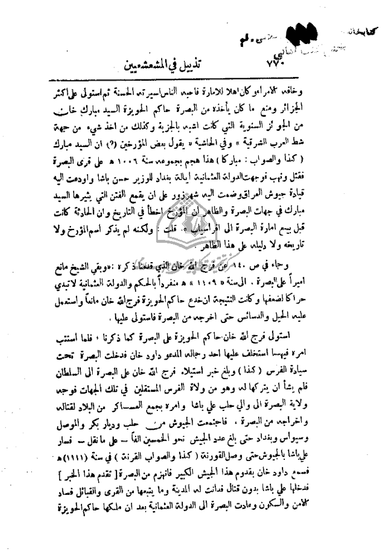 فقتل ونهب فوجهت الدولة العثمانية ايالة بغداد للوزير حسن باشا وأودعت إليه قيادة جيوش العراق وضمت إليه شهرزور على أن يقمع الفتن التي يثيرها السيد مبارك في جهات البصرة والظاهر أن المؤرخ اخطأ في التاريخ وان الحادثة كانت قبل بيع إمارة البصرة إلى افراسياب). قلت: ولكنه لم يذكر اسم المؤرخ ولا تاريخه ولا دليله على هذا الظاهر.