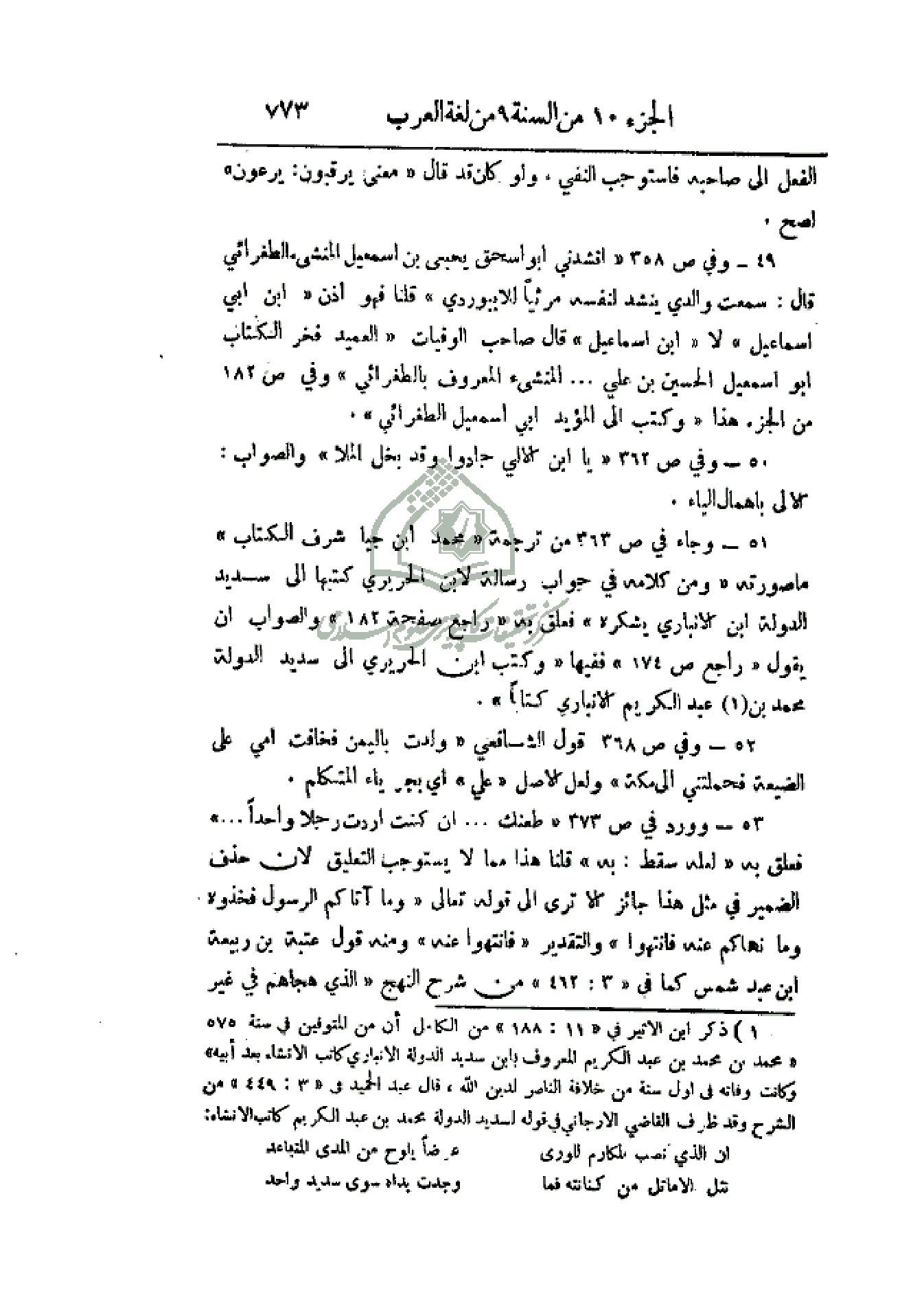 51 - وجاء في ص 363 من ترجمة (محمد ابن جيا شرف الكتاب) ما صورته (ومن كلامه في جواب رسالة لابن الحريري كتبها إلى سديد الدولة ابن الانباري يشكره) فعلق به (راجع صفحة 182) والصواب أن يقول (راجع ص 174) ففيها (وكتب ابن الحريري إلى سد يد الدولة محمد بن عبد الكريم الانباري كتاباً).