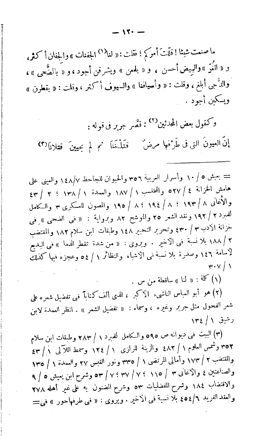 ما صنعت شيئاً! قللت أمركم؛ فقلت: لنا الجفنات والجِفان أكثر، والغُرّ والبِيض أحسن، ويلمعن ويشرقن أجود، وبالضُّحى والدُّجى أبلغ، وقلت: وأسيافنا والسيوف أكثر، وقلت: يقطرن ويسكبن أجود.