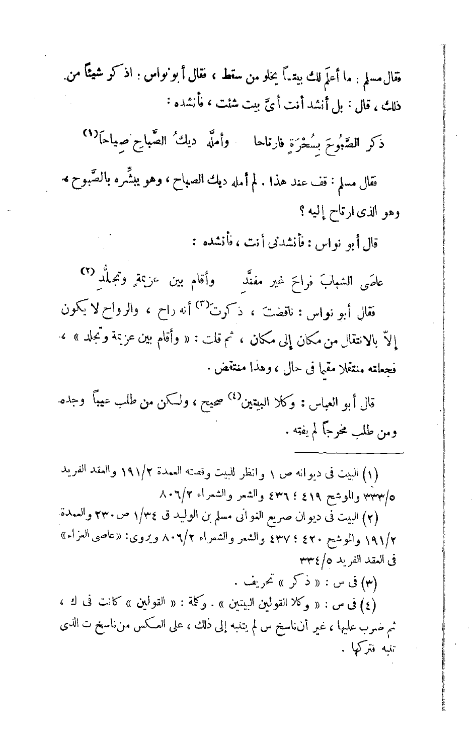 فقال أبو نواس: ناقضتَ، ذكرت أنه راح، والرواح لا يكون إلاّ بالانتقال من مكان إلى مكان، ثم قالت: وأقام بين عزيمة وتجلد، فجعلته منتقلاً مقيماً في حال، وهذا منتقض.