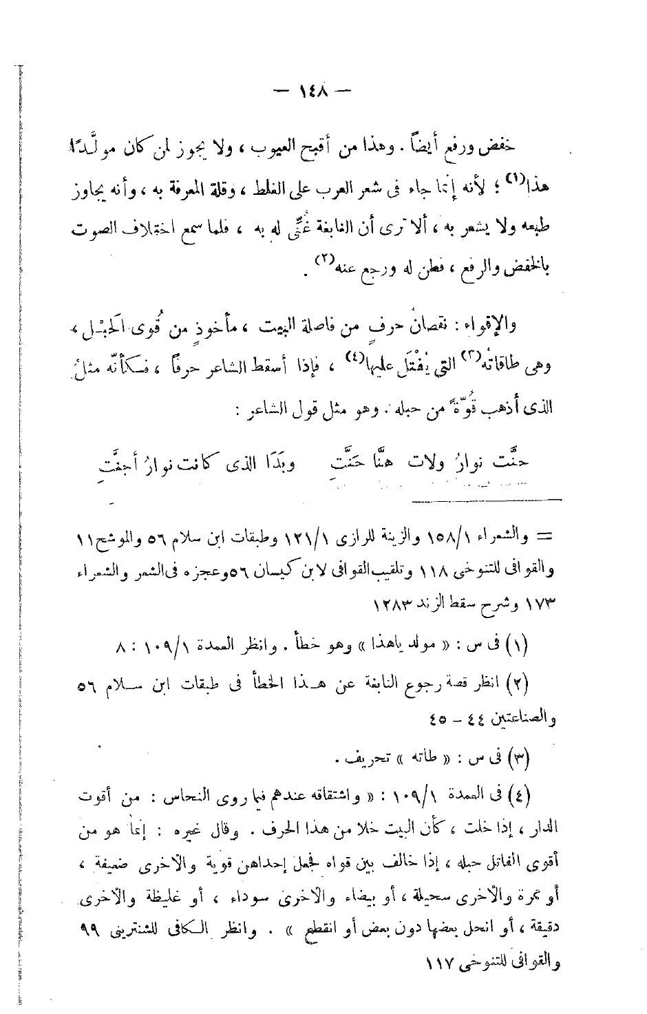 خفض ورفع أيضاً. وهذا من أقبح العيوب، ولا يجوز لمن كان مولَّداً هذا، لأنه إنما جاء في شعر العرب على الغلط، وقلة المعرفة به، وأنه يجاوز طبعه ولا يشعر به، ألا ترى أن النابغة غُنِّي له به، فلما سمع اختلاف الصوت بالخفض والرفع، فطن له ورجع عنه.