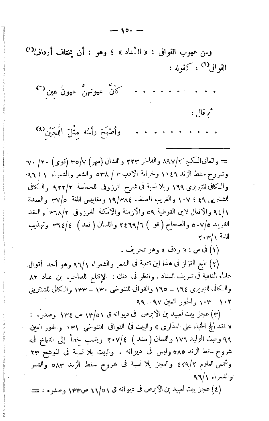 ومن عيوب القوافي: السِّناد، وهو: أن يختلف أردافُ القوافي، كقوله: