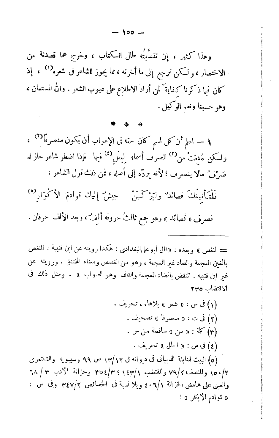 1 - اعلم أن كل اسم كان حقه في الإعراب أن يكون منصرفاً، ولكن مُنِعَتْ من الصرف أسماءٌ لِعِلَلٍ فيها. فإذا اضطر شاعر جاز له صَرْفُ ما لا ينصرف؛ لأنه يردّه إلى أصله، فمن ذلك قول الشاعر: