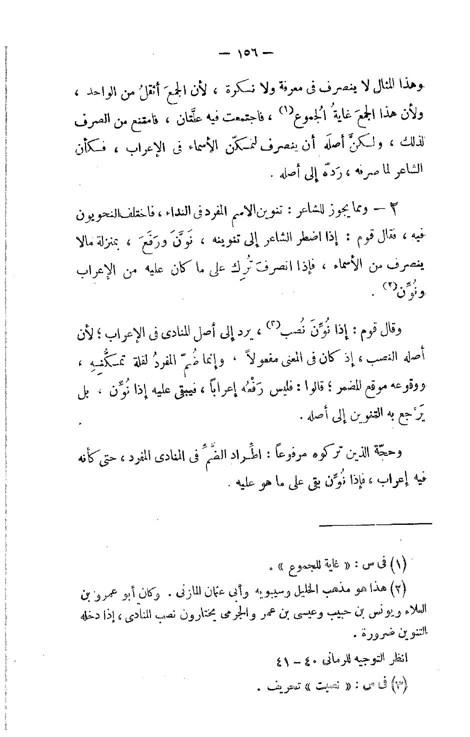2 - ومما يجوز للشاعر: تنوين الاسم المفرد في النداء، فاختلف النحويون فيه، فقال قوم: إذا اضطر الشاعر إلى تنوينه، نَوَّنَ ورَفَعَ، بمنزلة مالا ينصرف من الأسماء، فإذا انصرفَ تُرِك على ما كان عليه من الإعراب ونُوِّن.