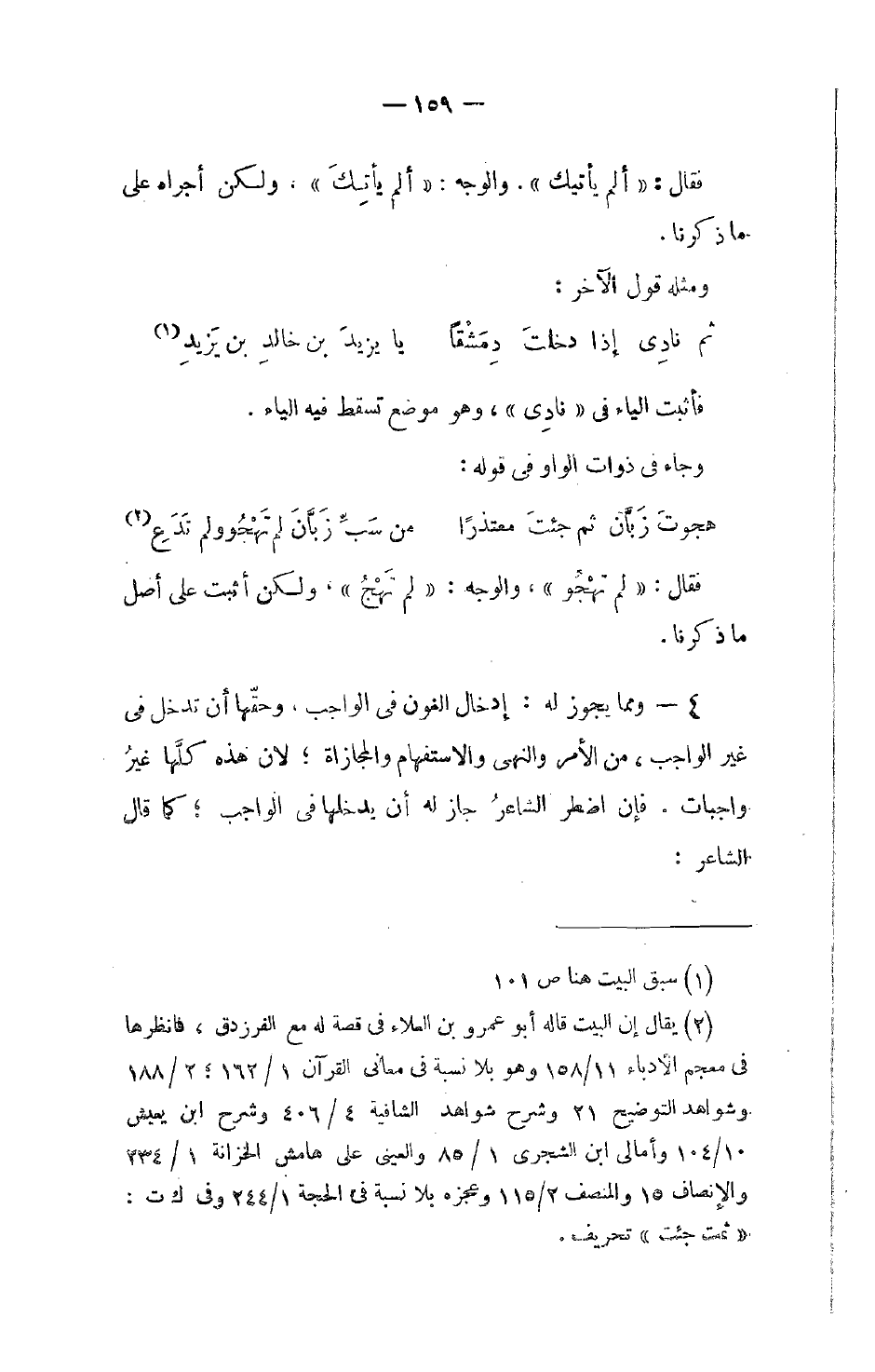 4 - ومما يجوز له: إدخال النون في الواجب، وحقّها أن تدخل في غير الواجب، من الأمر والنهي والاستفهام والمجازاة؛ لأن هذه كلَّها غيرُ واجبات. فإن اضطر الشاعرُ جاز له أن