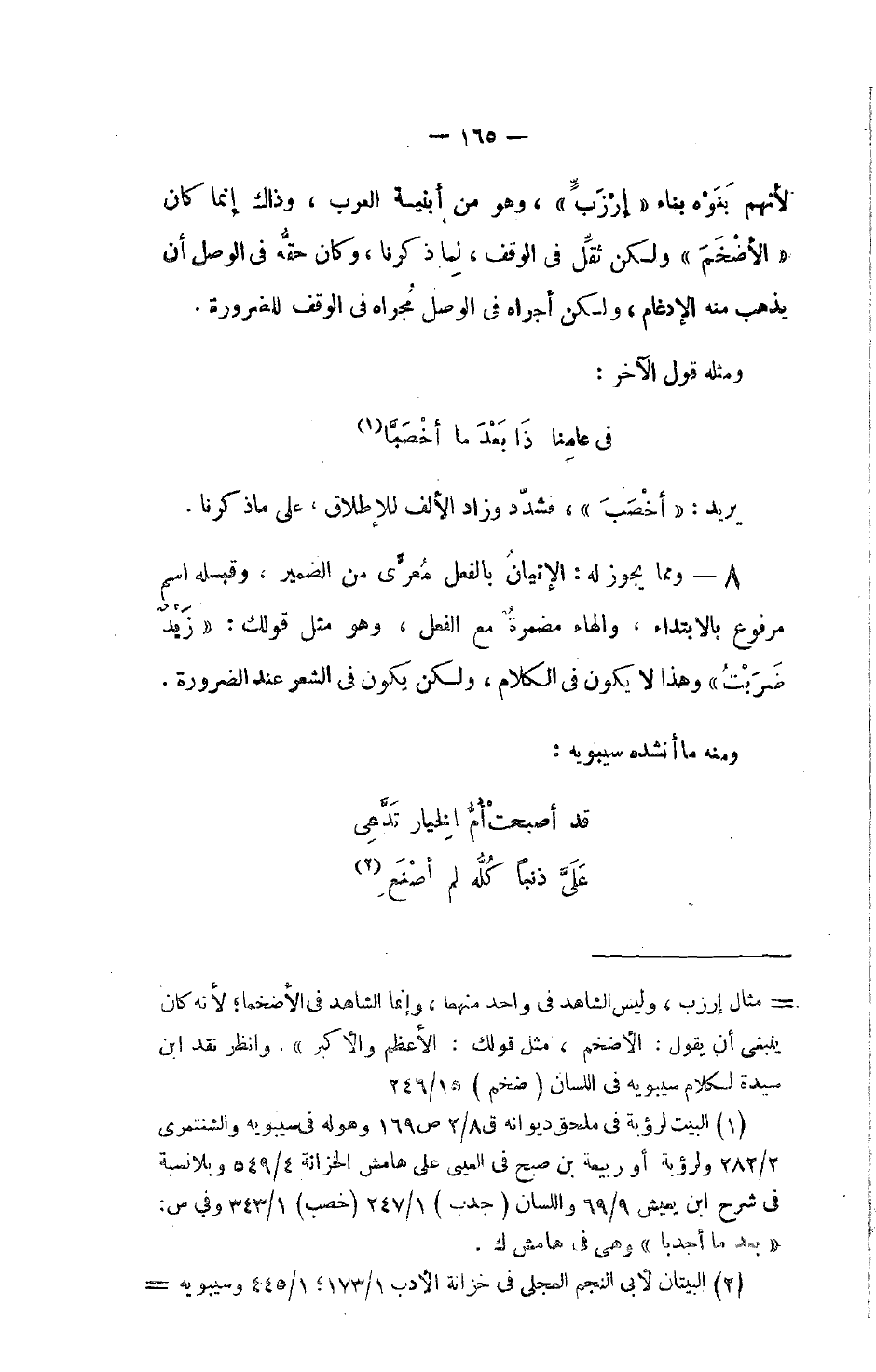 لأنهم بَنَوْه بناء إرْزَبٍّ، وهو من أبنية العرب، وذاك إنما كان الأضْخََمَ ولكن ثقِّل في الوقف، لِما ذكرنا، وكان حقُّه في الوصل أن يذهب منه الإدغام، ولكن أجراه في الوصل مُجراه في الوقف للضرورة.