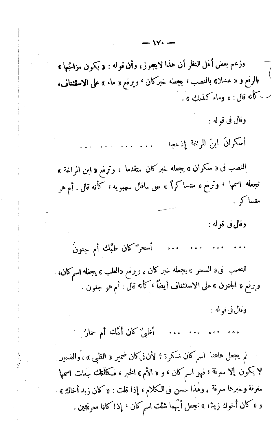 النصب في السحر يجعله خبر كان، ويرفع الطب يجعله اسم كان، ويرفع الجنون على الاستئناف أيضاً، كأنه قال: أم هو جنون.