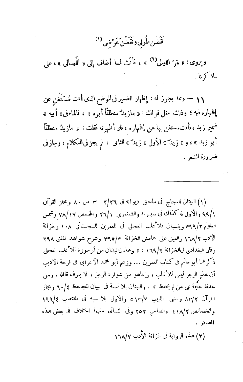11 - ومما يجوز له: إظهار الضمير في الموضع الذي أنت مُسْتَغْنٍ عن إظهاره فيه؛ وذلك مثل قولك: ما زيدٌ منطلقاً أبوه، فالهاء في أبيه ضمير زيد، فأنت مستغن بها عن إظهاره، فلو أظهرته فقلت: ما زيدٌ منطلقاً أبو زيد، وزيدٌ الأول زيدٌ الثاني، لم يجز في الكلام، وجاز في ضرورة الشعر.