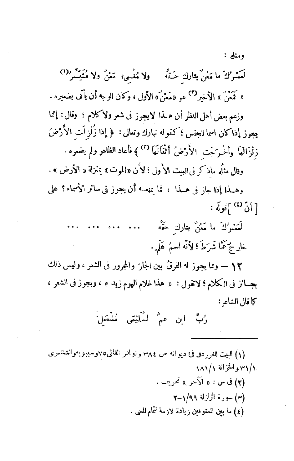 وزعم بعض أهل النظر أن هذا لا يجوز في شعر ولا كلام؛ وقال: إنما يجوز إذا كان اسما للجنس، كقوله تبارك وتعالى: {إِذَا زُلْزِلَتِ الْأَرْضُ زِلْزَالَهَا، وَأَخْرَجَتِ الْأَرْضُ أَثْقَالَهَا} فأعاد الظاهر ولم يضمره.