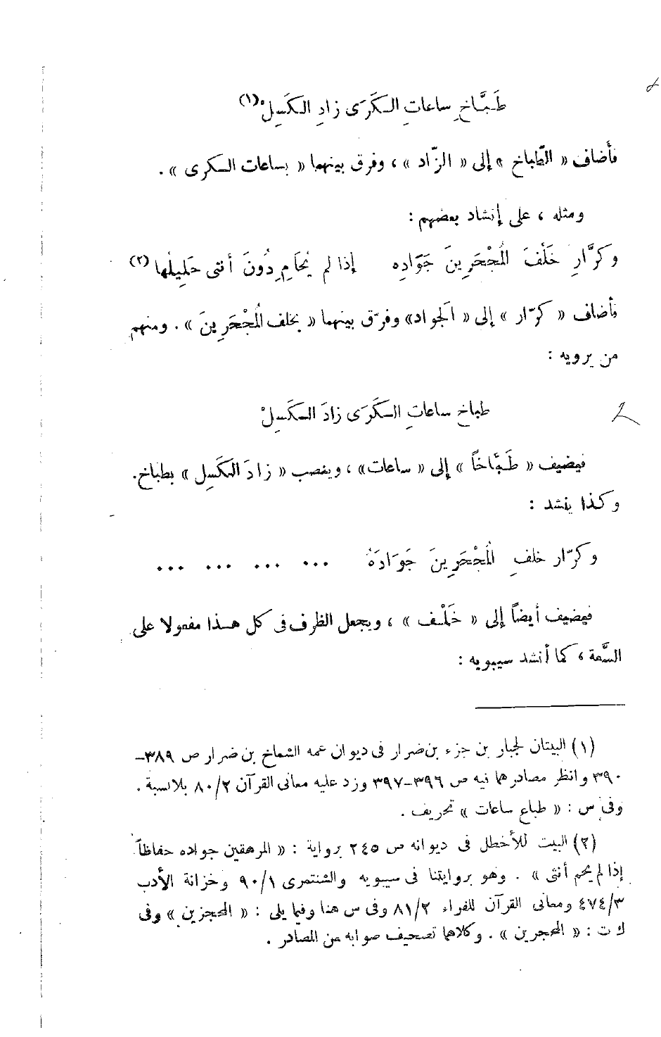 فيضيف طَبَّاخاً إلى ساعات، وينصب زادَ الكَسِل بطباخ. وكذا ينشد: