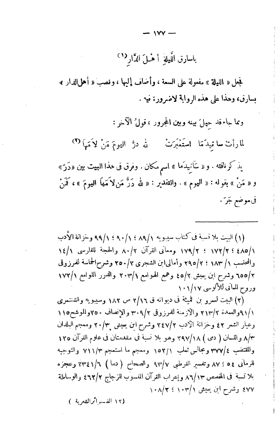 فجعل الليلة مفعولة على السعة، وأضاف إليها، ونصب أهل الدار بسارق، وهذا على هذه