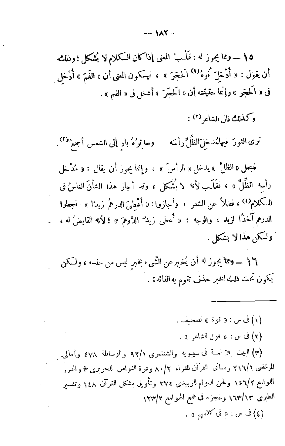 15 - ومما يجوز له: قَلْبُ المعنى إذا كان الكلام لا يُشكل؛ وذلك أن يقول: أُدخِلَ فُوهُ الحَجَرَ فيكون المعنى أن الفَمَ أُدْخِل في الحَجَر وإنما حقيقته أن الحَجَرَ أدخل في الفم.