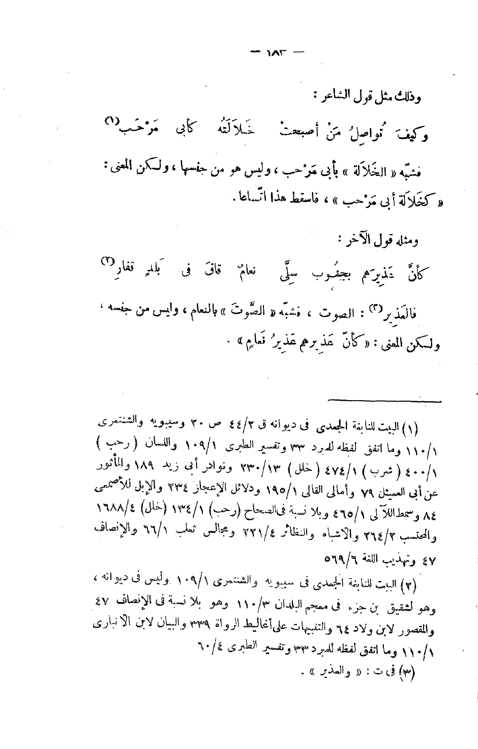فشبّه الخَلالَة بأبي مَرْحب، وليس هو من جنسها، ولكن المعنى: كخَلالَة أبي مَرحْب فأسقط هذا اتّساعاً.