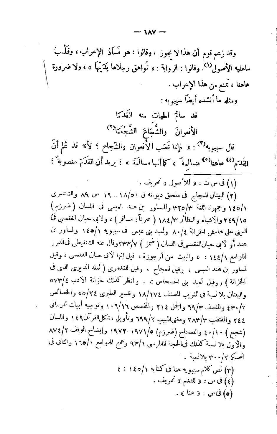 قال سيبويه: فإنما نَصَب الأُفعوان والشّجاع؛ لأنه قد عُلم أنّ القَدَم هاهنا مسالِمةٌ، كما أنها مسالَمةٌ؛ يريد أن القَدَمَ منصوبةٌ،