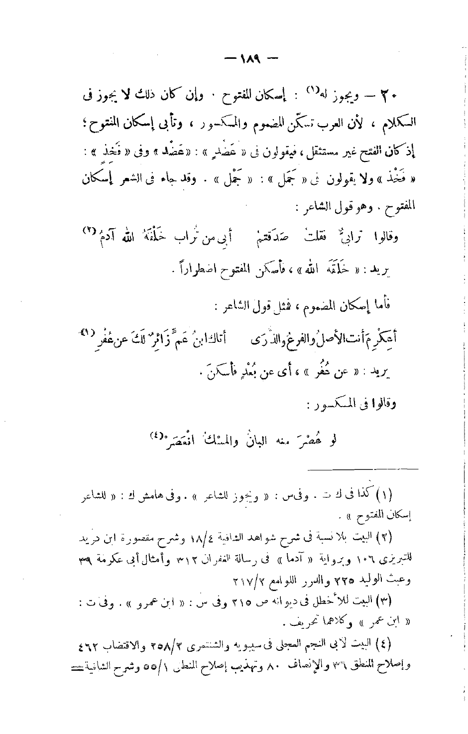 20 - ويجوز له: إسكان المفتوح. وإن كان ذلك لا يجوز في الكلام، لأن العرب تُسكّن المضموم والمكسور، وتأبى إسكان المفتوح؛ إذ كان الفتح غير مستثقل، فيقولون في عَضُدٍ: عَضْد وفي فَخِذٍ: فَخْذ ولا يقولون في جَمَل: جَمْل. وقد جاء في الشعر إسكان المفتوح. وهو قول الشاعر: