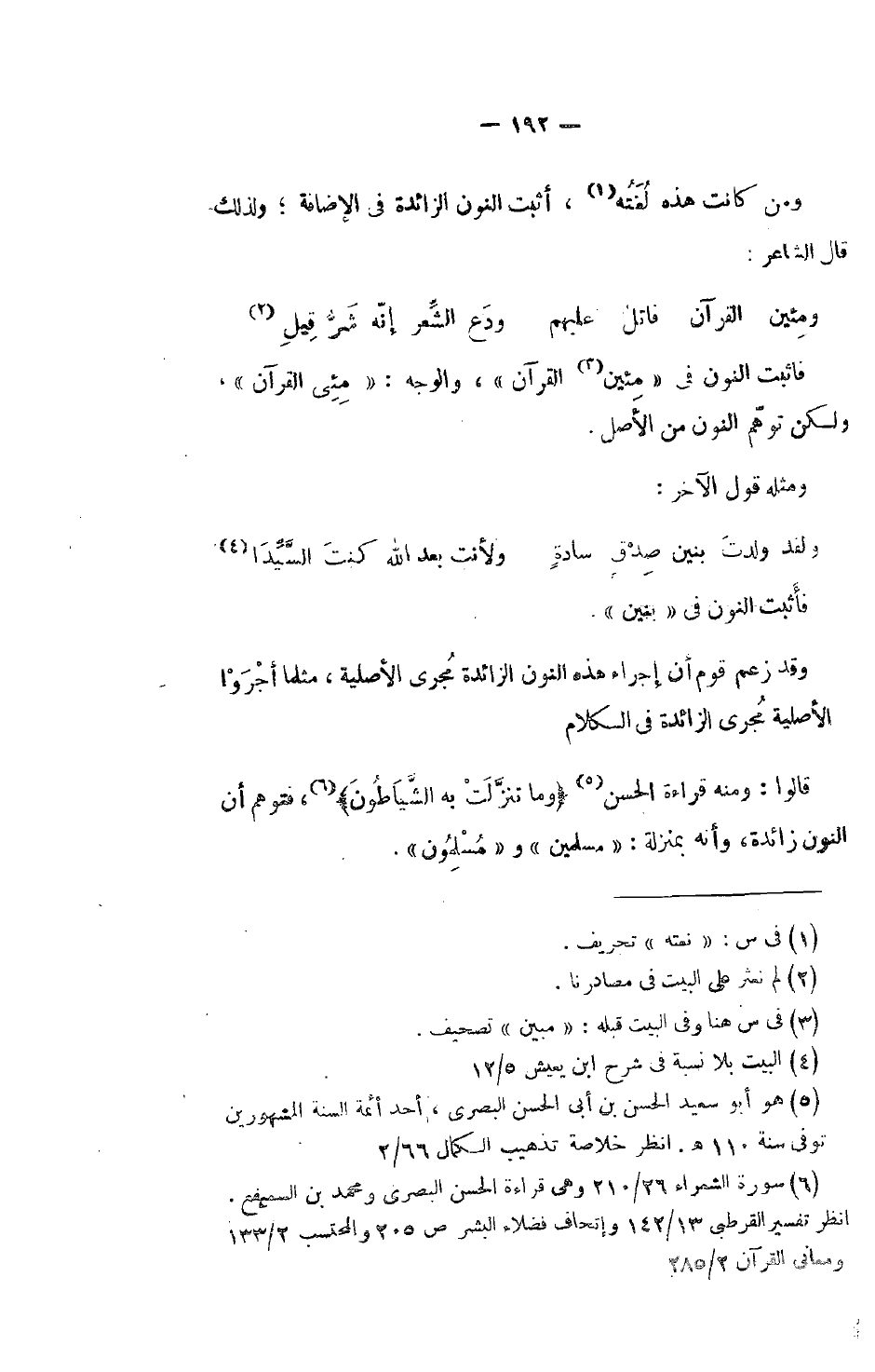 قالوا: ومنه قراءة الحسن {وَمَا تَنَزَّلَتْ بِهِ الشَّيَاطِينُ}، فتوهم أن النون زائدة، وأنه بمنزلة: مسلمين ومُسْلِمُون.