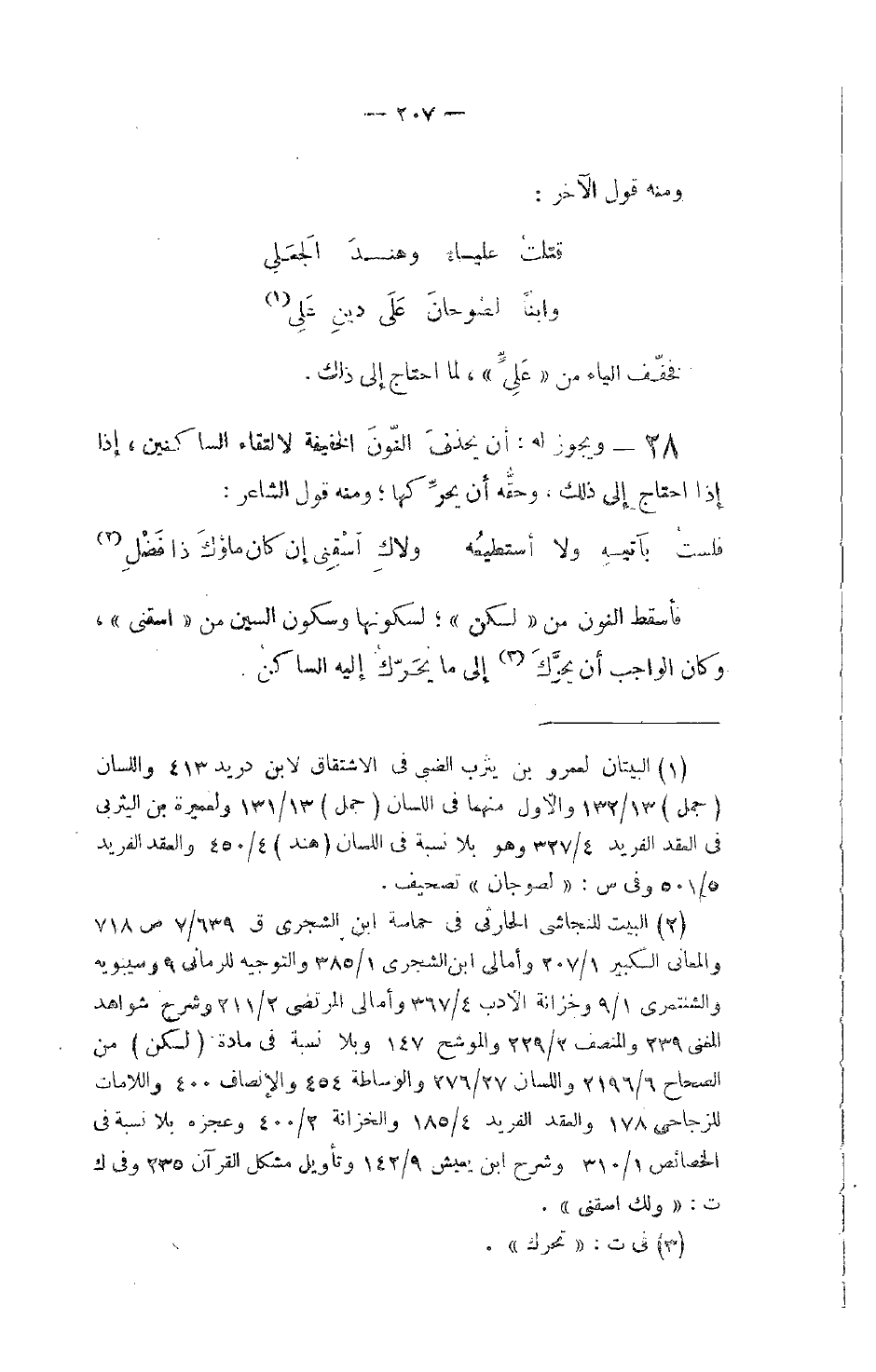 28 - ويجوز له أن يحذف النّون الخفيفة لالتقاء الساكنين، إذا احتاج إلى ذلك، وحقُّه أن يحرِّكها؛ ومنه قول الشاعر:
