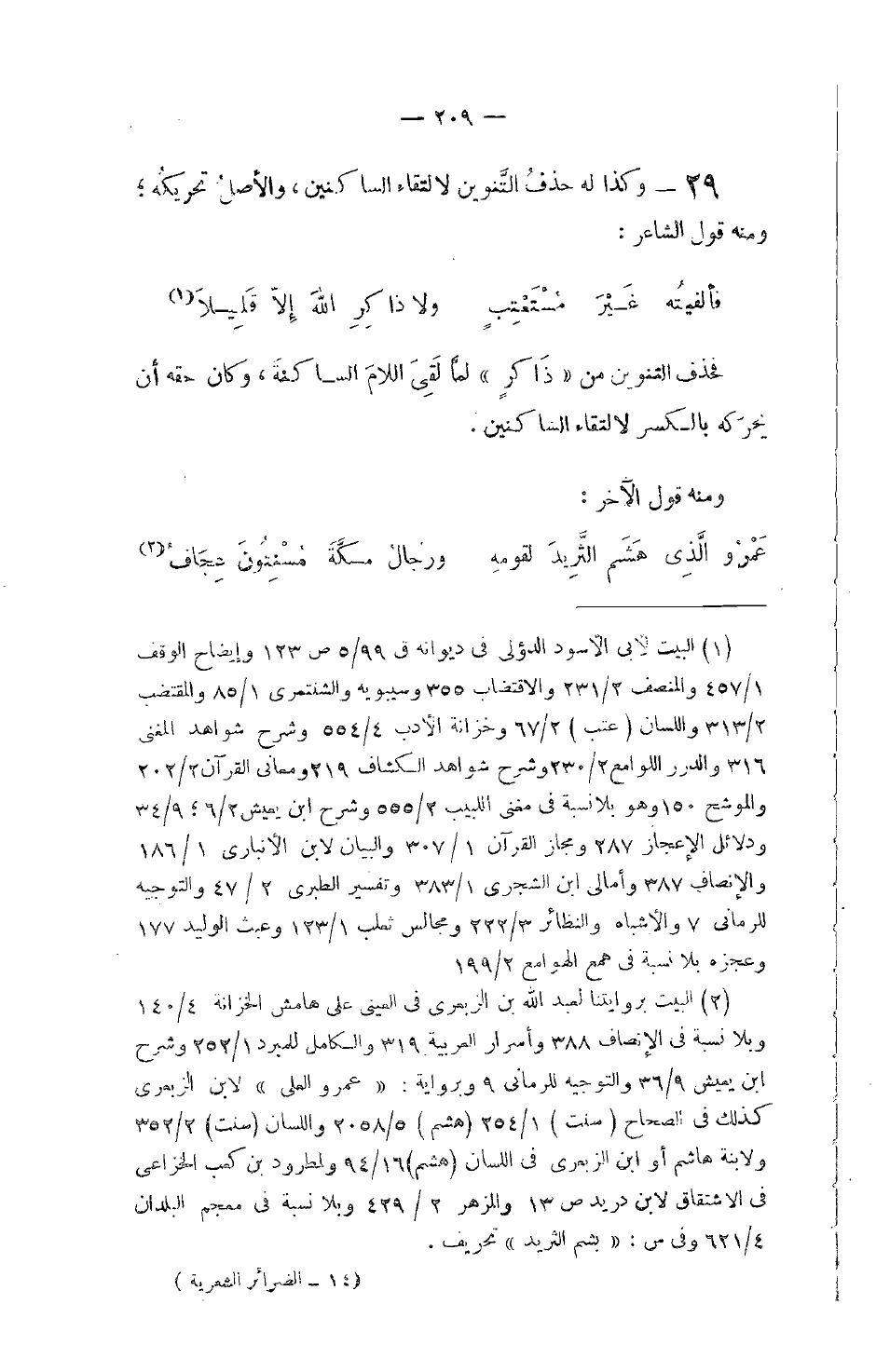 29 - وكذا له حذفُ التَّنوين لالتقاء الساكنين، والأصلُ تحريكُه؛ ومنه قول الشاعر: