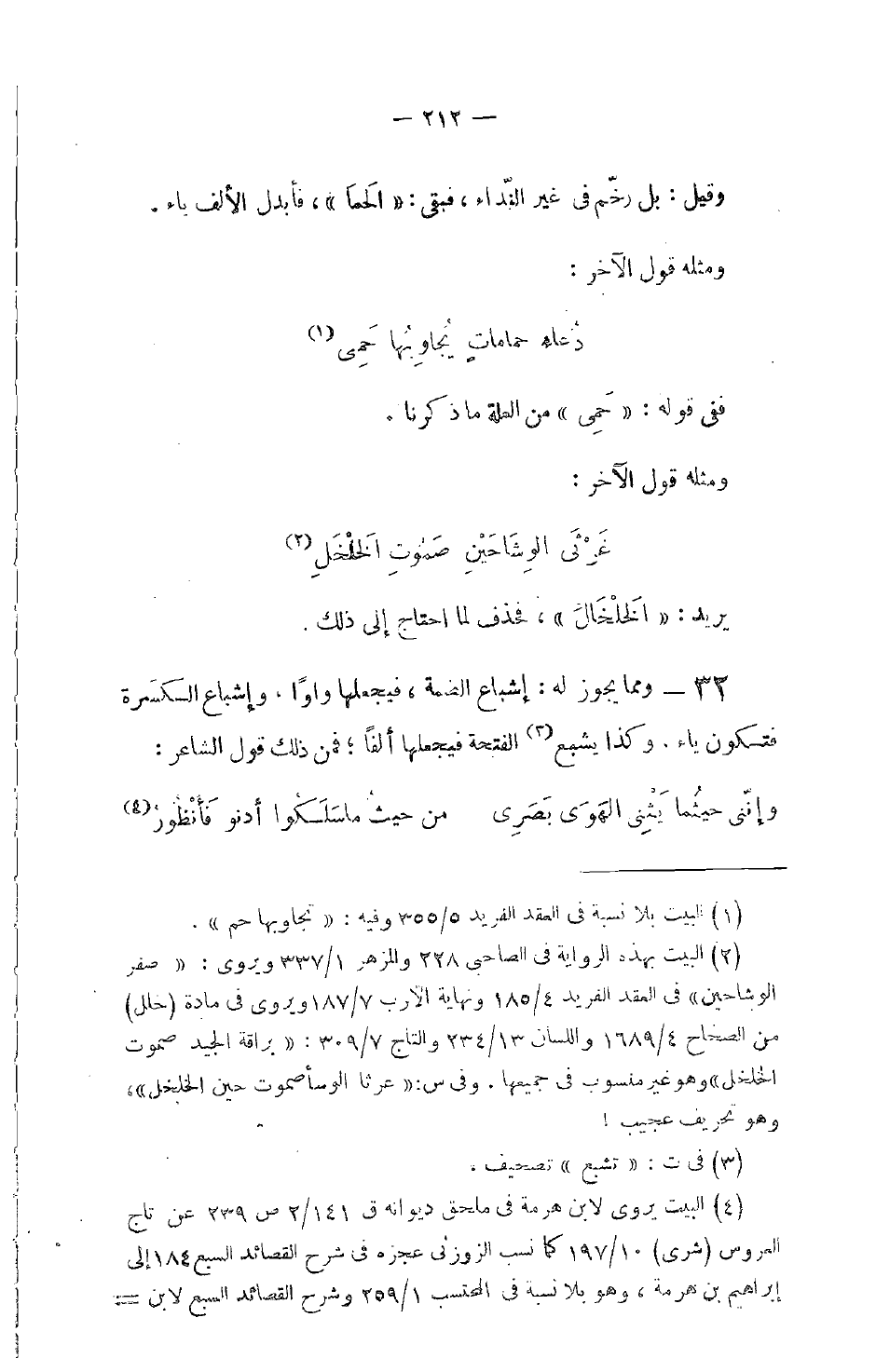 32 - ومما يجوز له: إشباع الضمة، فيجعلها واواً، وإشباع الكسرة فتكون ياء، وكذا يشبع الفتحة فيجعلها ألفاً؛ فمن ذلك قول الشاعر: