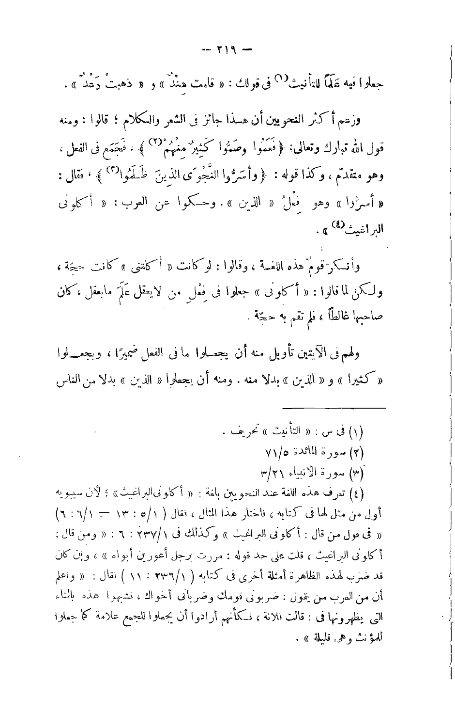 وزعم أكثر النحويين أن هذا جائز في الشعر والكلام؛ قالوا: ومنه قول الله تبارك وتعالى: {فَعَمُواْ وَصَمُّواْ كَثِيرٌ مِّنْهُمْ}، فَجَمَع في الفعل، وهو متقدّم، وكذا قوله: {وَأَسَرُّواْ النَّجْوَى الَّذِينَ ظَلَمُواْ}، فقال: أسرُّوا وهو فِعْلُ الذين. وحكوا عن العرب: أكلوني البراغيث.