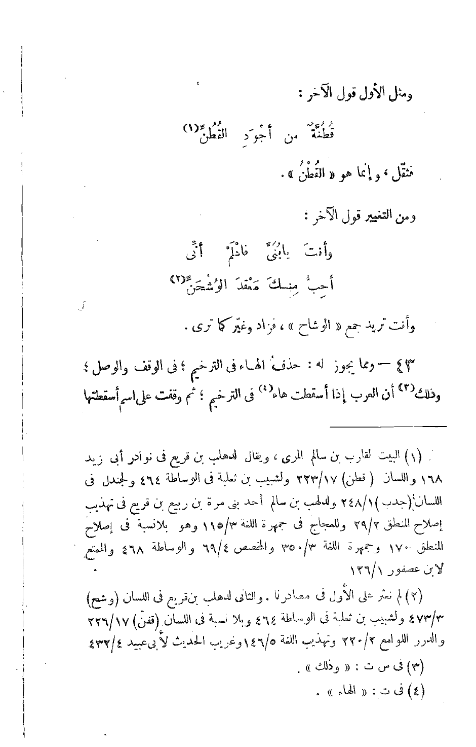 43 - ومما يجوز له: حذف الهاء في الترخيم؛ في الوقف والوصل؛ وذلك أن العرب إذا أسقطت هاء في الترخيم؛ ثم وقفت على اسم أسقطتها
