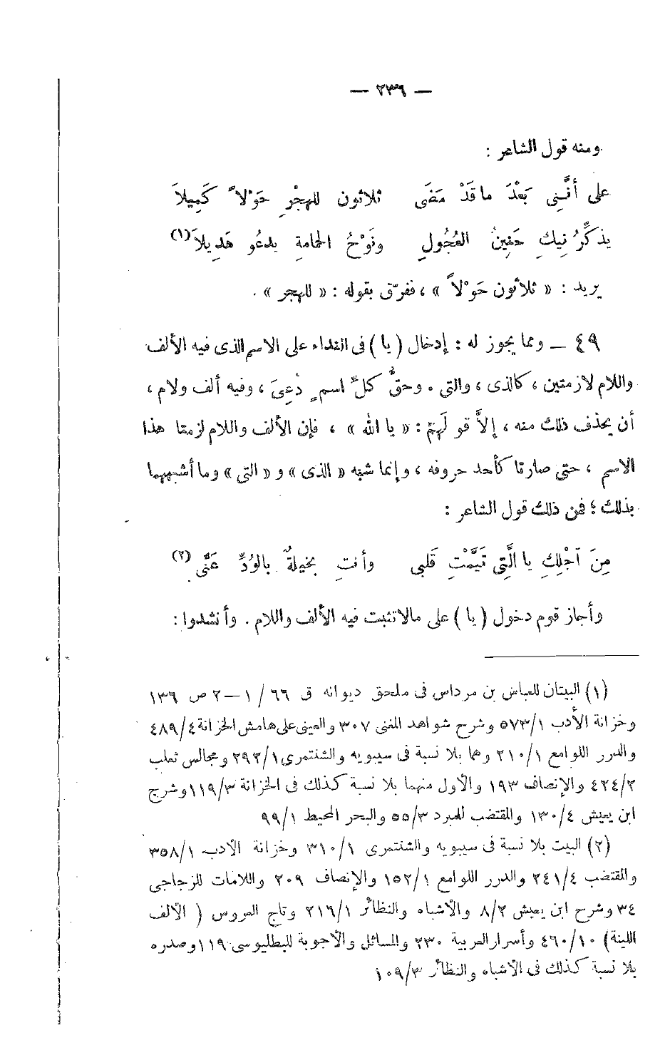 49 - ومما يجوز له: إدخال (يا) في النداء على الاسم الذي فيه الألف واللام لازمتين، كالذي، والتي. وحقُّ كلِّ اسمٍ دُعِيَ، وفيه ألف ولام، أن يحذف ذلك منه، إلاَّ قولَهم: يا الله، فإن الألف واللام لزمتا هذا الاسم، حتى صارتا كأحد حروفه، وإنما شبه الذي والتي وما أشبههما بذلك؛ فمن ذلك قول الشاعر: