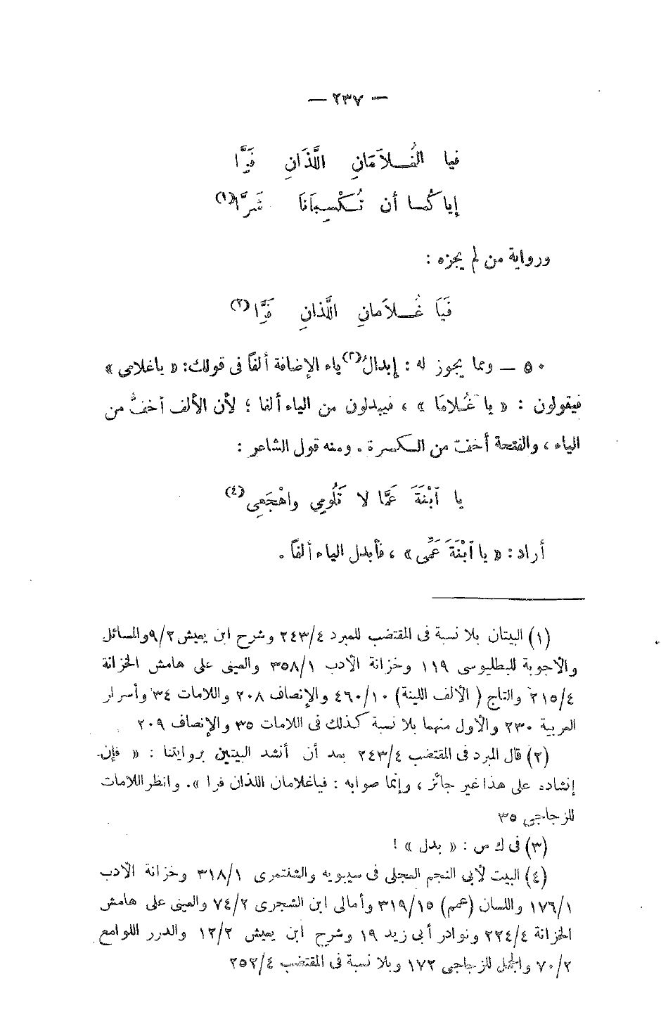 50 - ومما يجوز له: إبدالُ ياء الإضافة ألفاً في قولك: يا غلامي، فيقولون: يا غُلامَا، فيبدلون من الياء ألفاً؛ لأن الألف أخفُّ من الياء، والفتحة أخفّ من الكسرة، ومنه قول الشاعر: