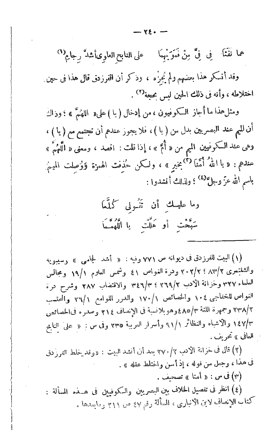 ومثل هذا ما أجاز الكوفيون، من إدخال (يا) على اللهُمَّ، وذاك أن الميم عند البصريين بدل من (يا)، فلا يجوز عندهم أن تجتمع مع (يا)، وهي عند الكوفيين الميم من أُمَّ، إذا قلت: اقصد، ومعنى اللهُمَّ عندهم: يا الله أُمَّنا بخيرٍ، ولكن حُذِفت الهمزة وَوُصِلت الميمُ باسم الله عزّ وجلَّ؛ ولذلك أنشدوا: