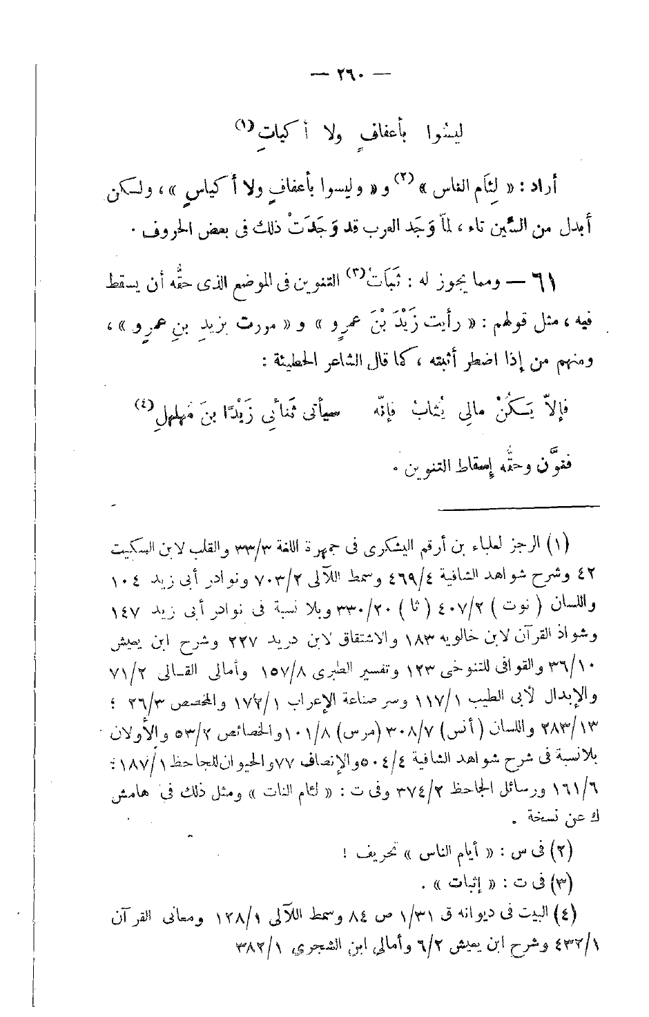 61 - ومما يجوز له: ثَبَاتُ التنوين في الموضع الذي حقُّه أن يسقط فيه، مثل قولهم: رأيت زَيْدَ بْنَ عمرٍو ومررت بزيدِ بنِ عمروٍ، ومنهم من إذا اضطر أثبته، كما قال الشاعر الحطيئة: