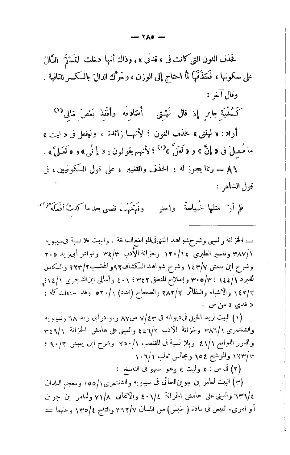 فحذف النون التي كانت في قدني، وذاك أنها دخلت لتَسْلَمَ الدَّالُ على سكونها، فَحَذَفَها لمَّا احتاج إلى الوزن، وحَرَّك الدالَ بالكسر للقافية.