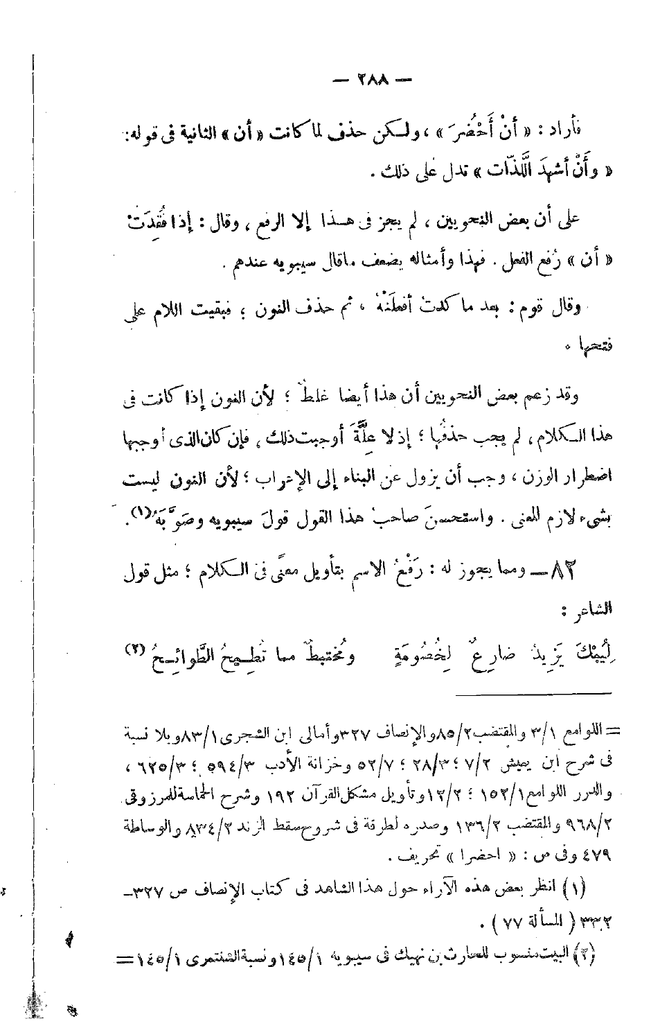 وقد زعم بعض النحويين أن هذا أيضاً غلطٌ؛ لأن النون إذا كانت في هذا الكلام، لم يجب حذفُها؛ إذ لا عِلَّةَ أوجبت ذلك، فإن كان الذي أوجبها اضطرار الوزن، وجب أن يزول عن البناء إلى الأعراب؛ لأن النون ليست بشيءٍ لازم المعنى. واستحسنَ صاحبُ هذا القول قولَ سيبويه وصَوَّبَهُ.